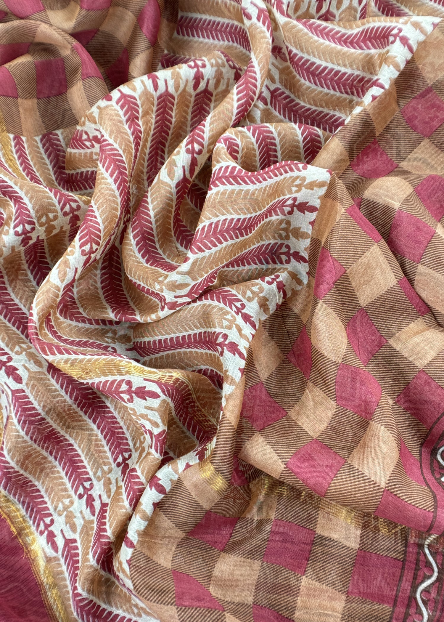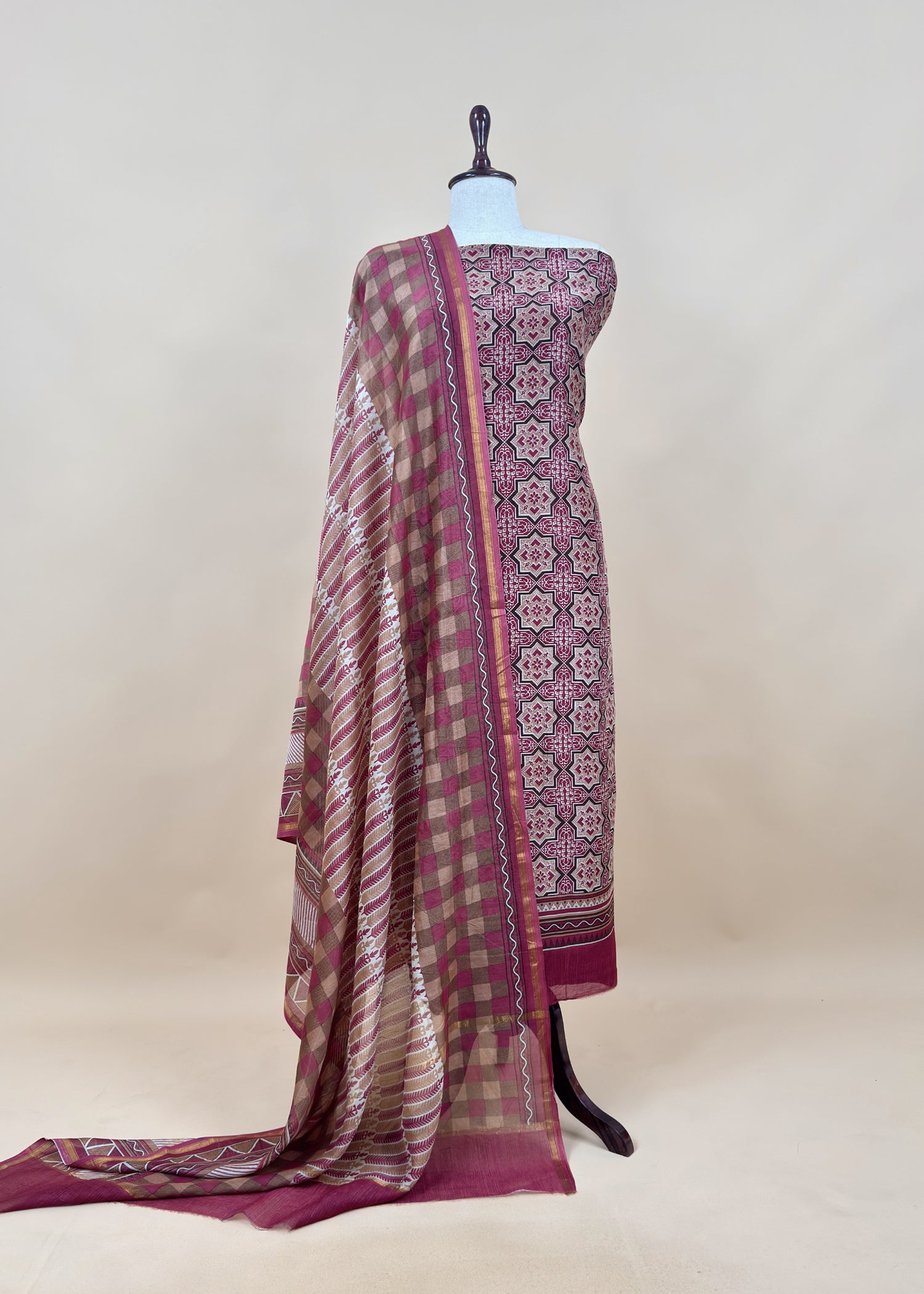 Red Ajrakh Mahehswari Silk Unstitched Suit With Dupatta