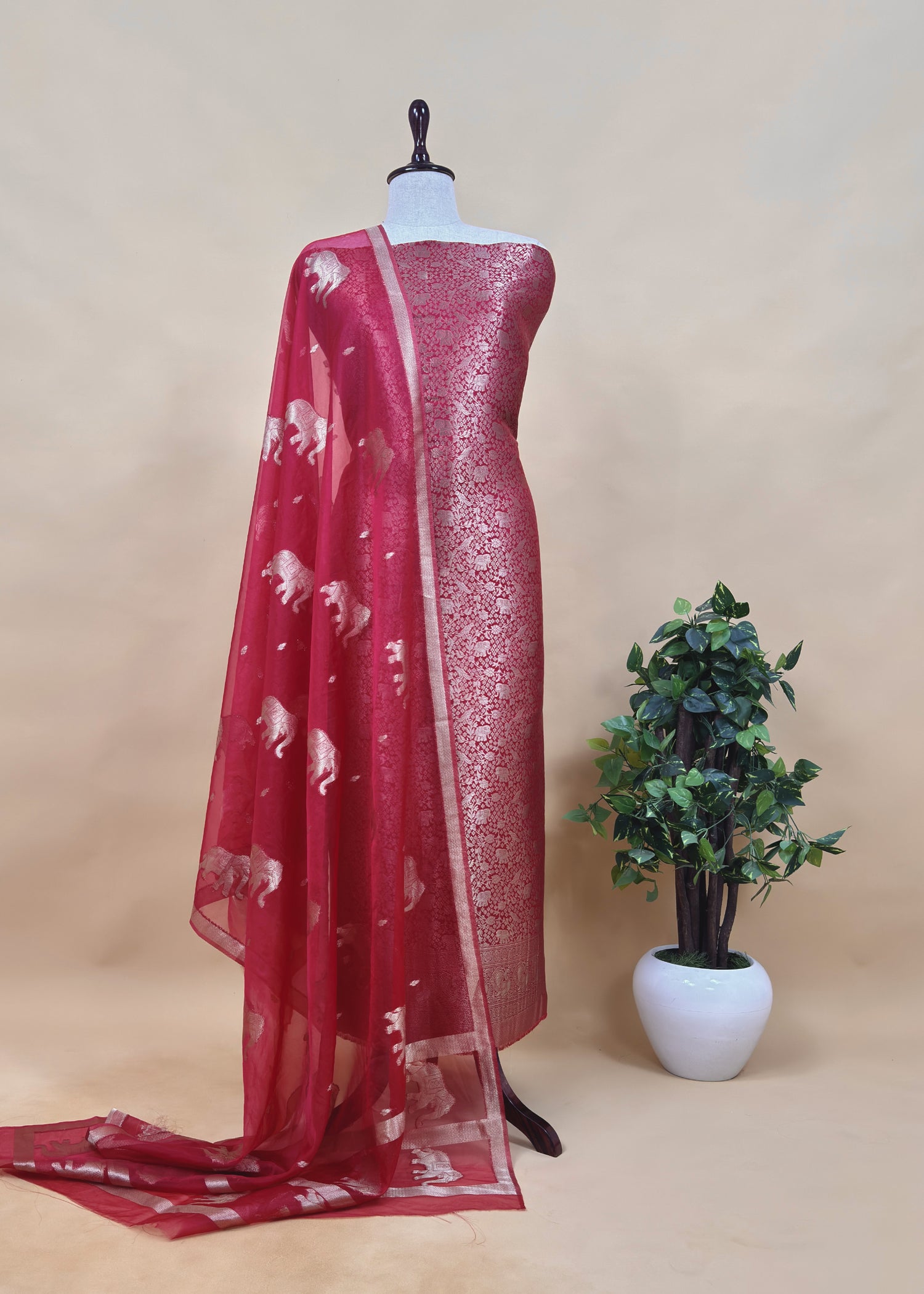 Red Banarasi Silk Brocade Suit With Organza Dupatta