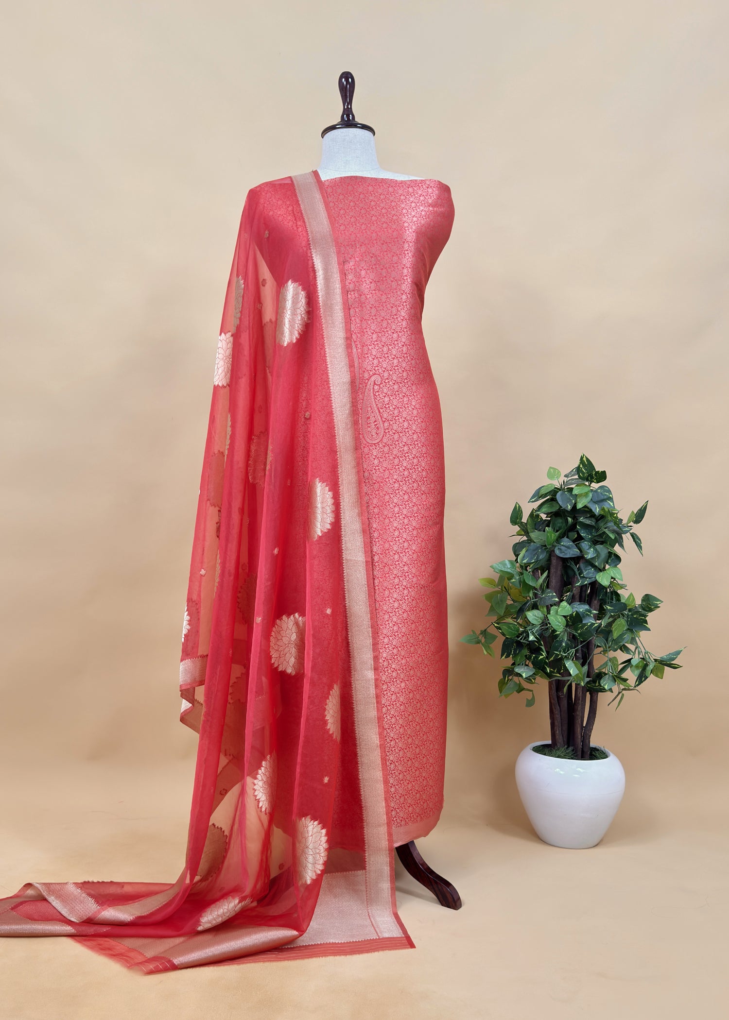 Red Banarasi Silk Brocade Suit With Organza Dupatta