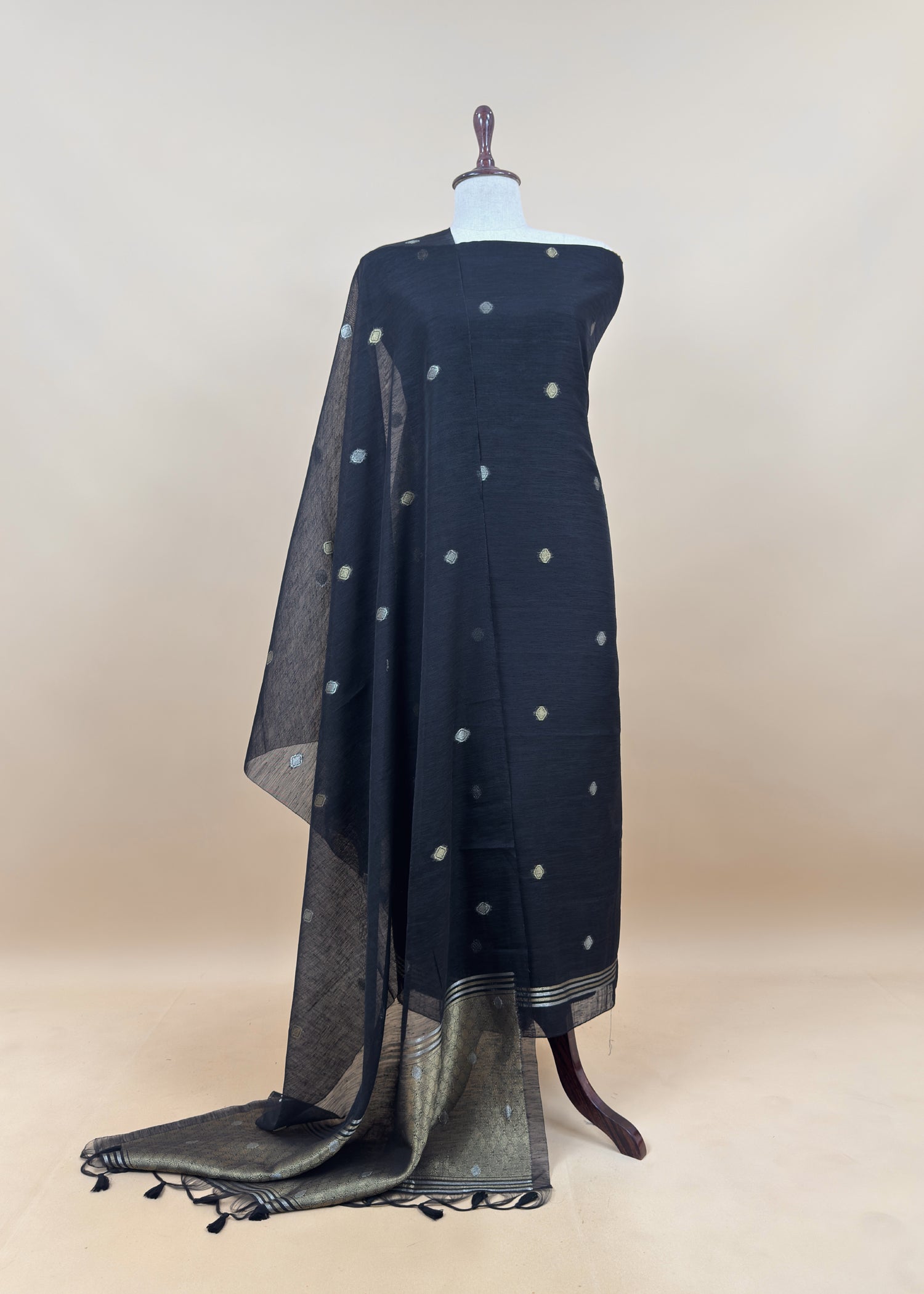 Designer made suit in Chanderi is embraced with fine gold zari jamdani weaving bootis all the kurta and both ends of dupatta. Handmade tassels on the ends of dupatta gives the suit an unmatched appeal. The three-piece suit comes with plain crepe silk bottom.