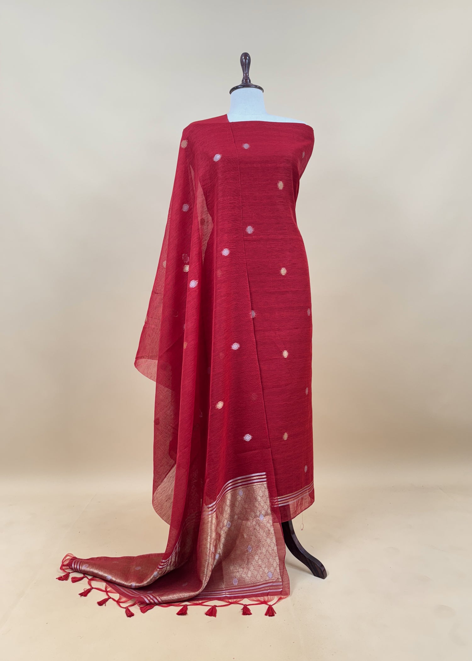 Red Chanderi Unstitched Suit With Gold Zari Jamdani Weaving