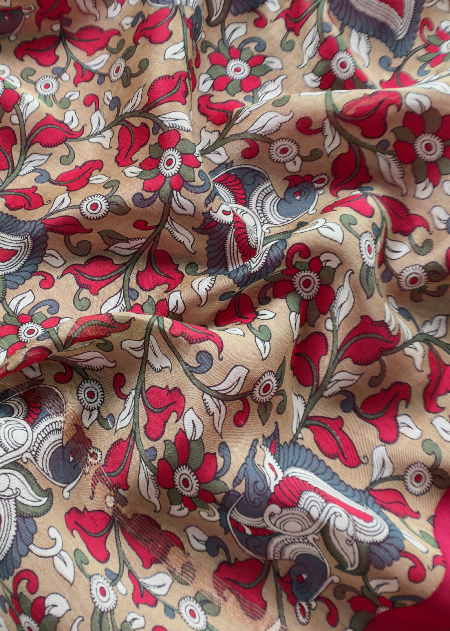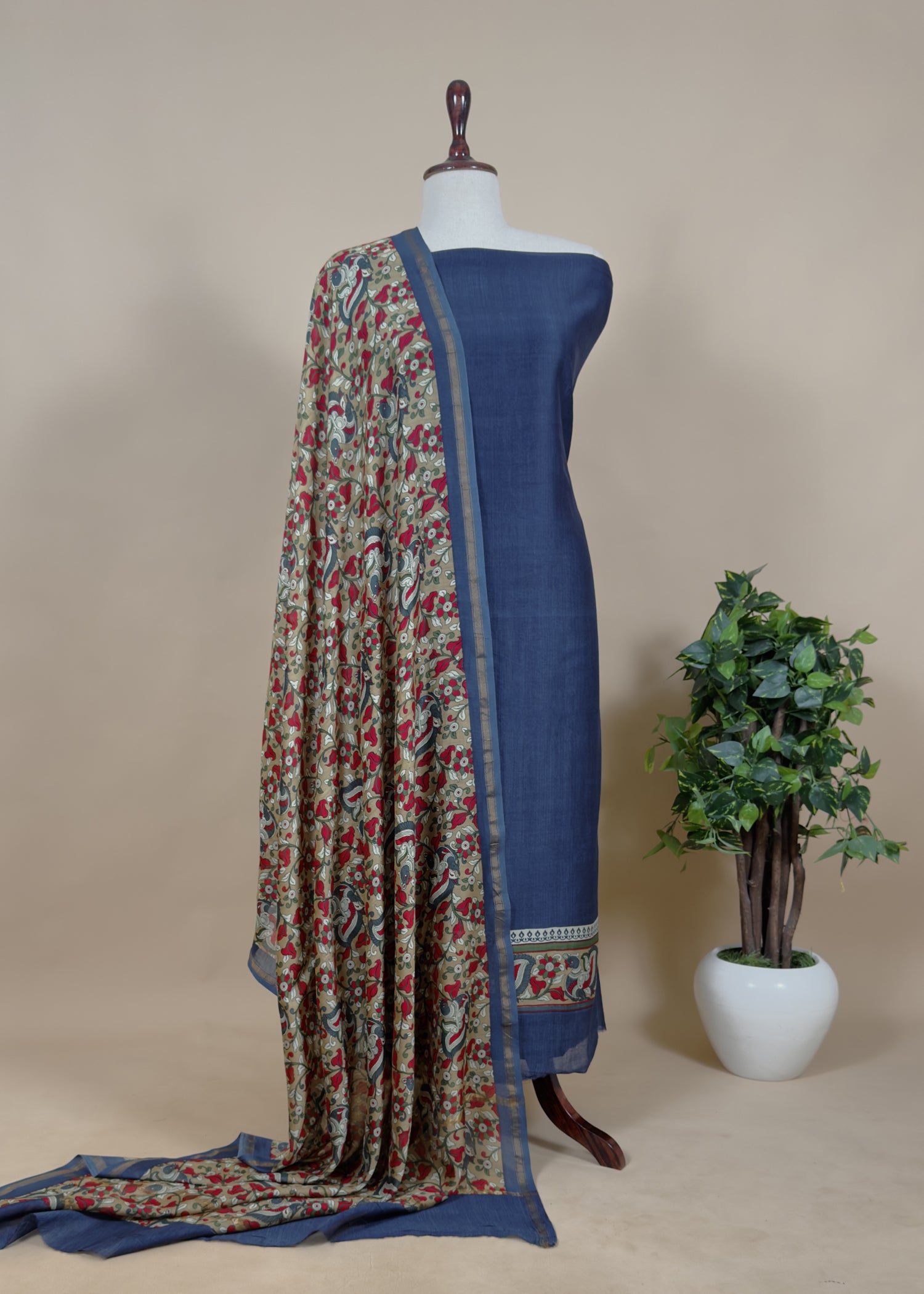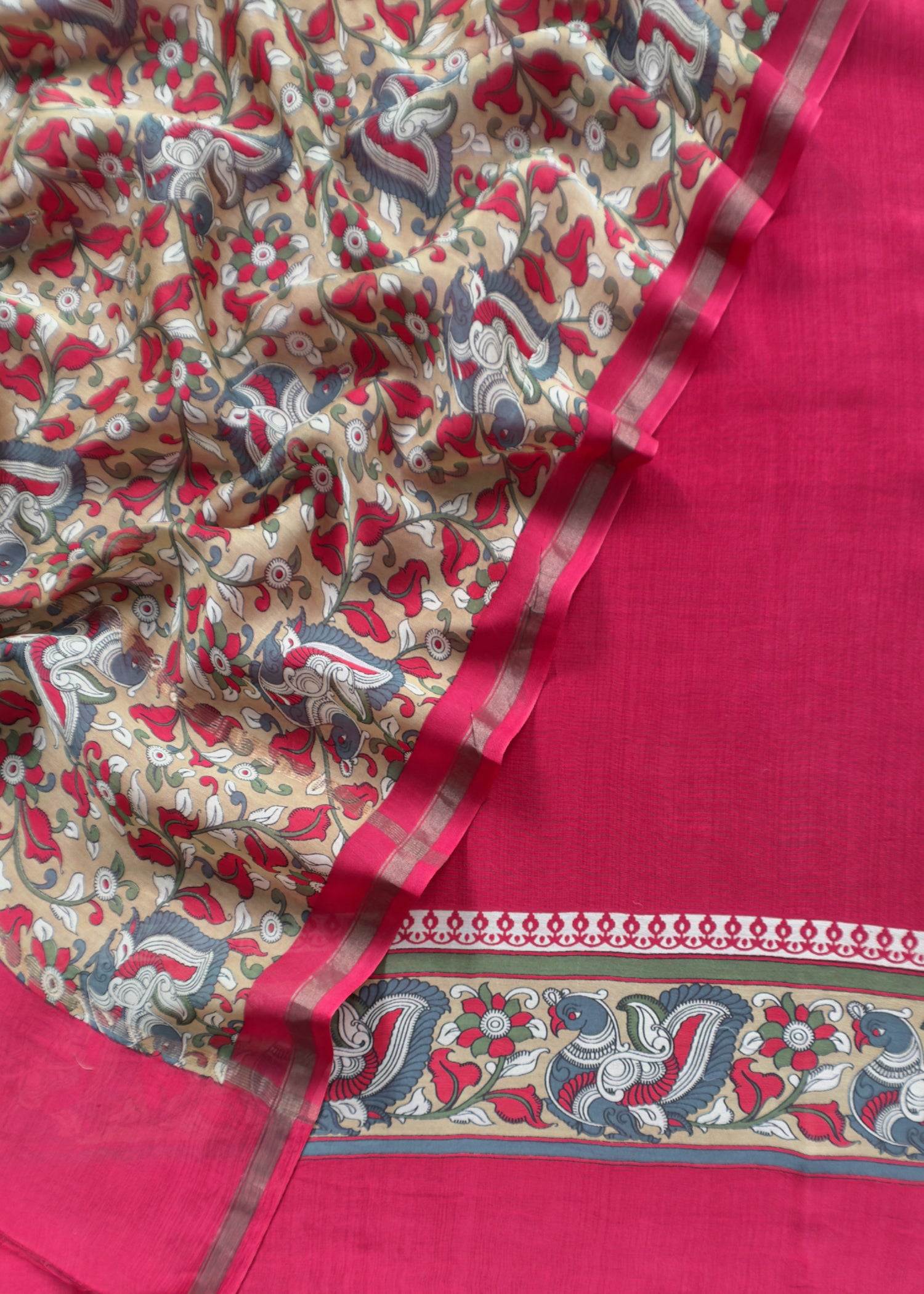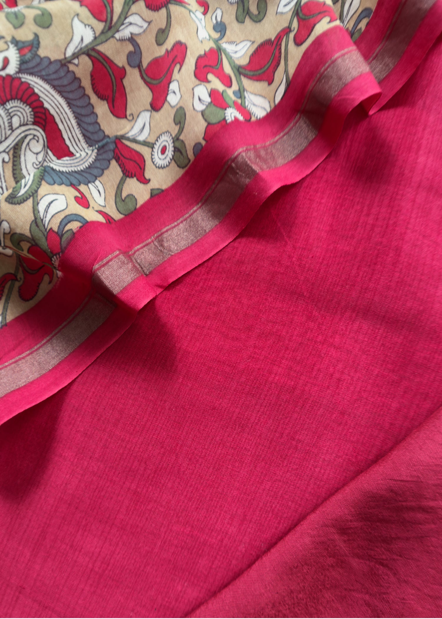 Red Handloom Maheshwari Silk Unstitched Suit with Kalamkari Dupatta