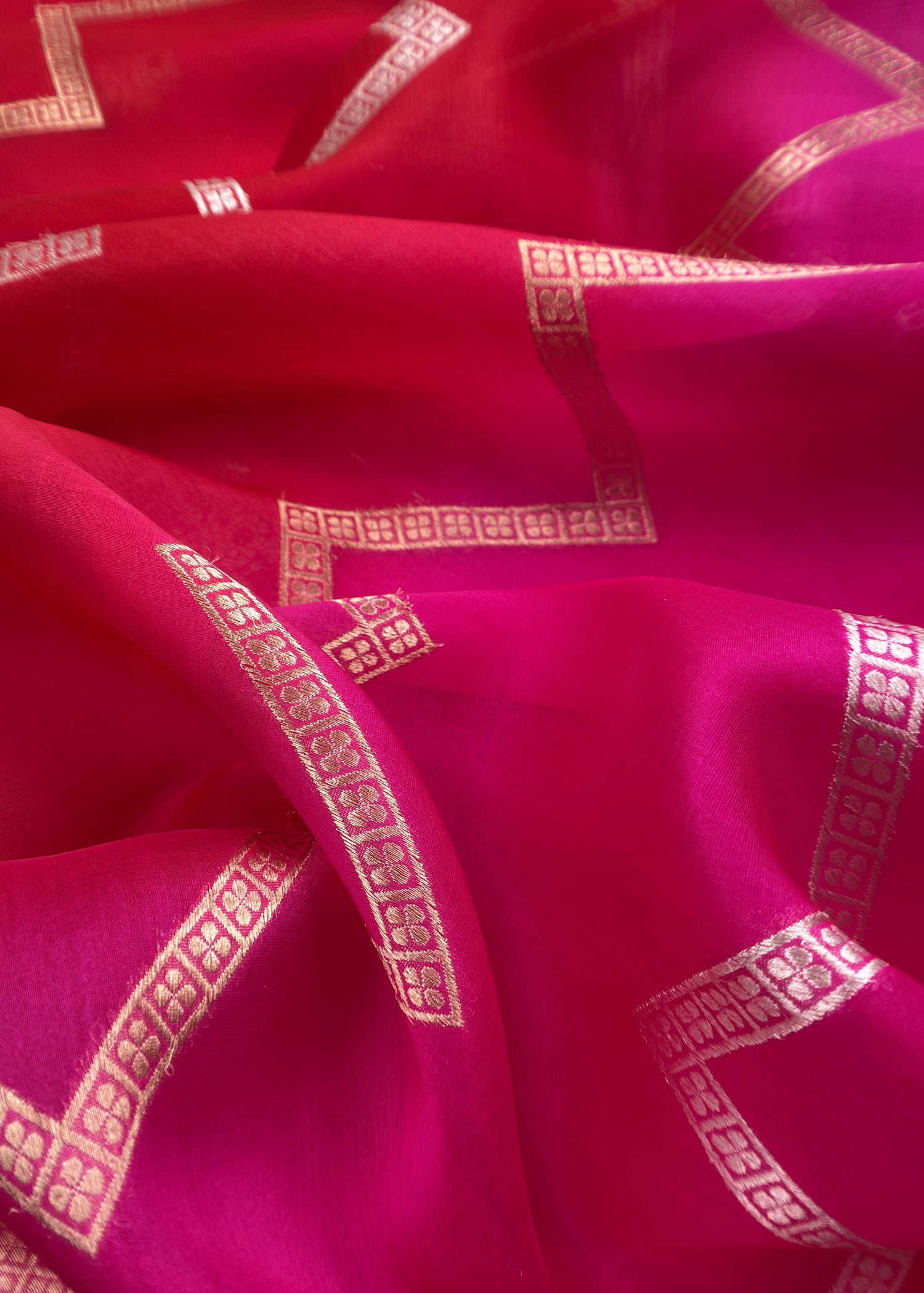 Handloom silk kurta with kadwa meenakari gold zari woven phool bootis paired with matching pure silk lowers comes with ombré laal Rani pure kora silk dupatta with diagonal woven panels.