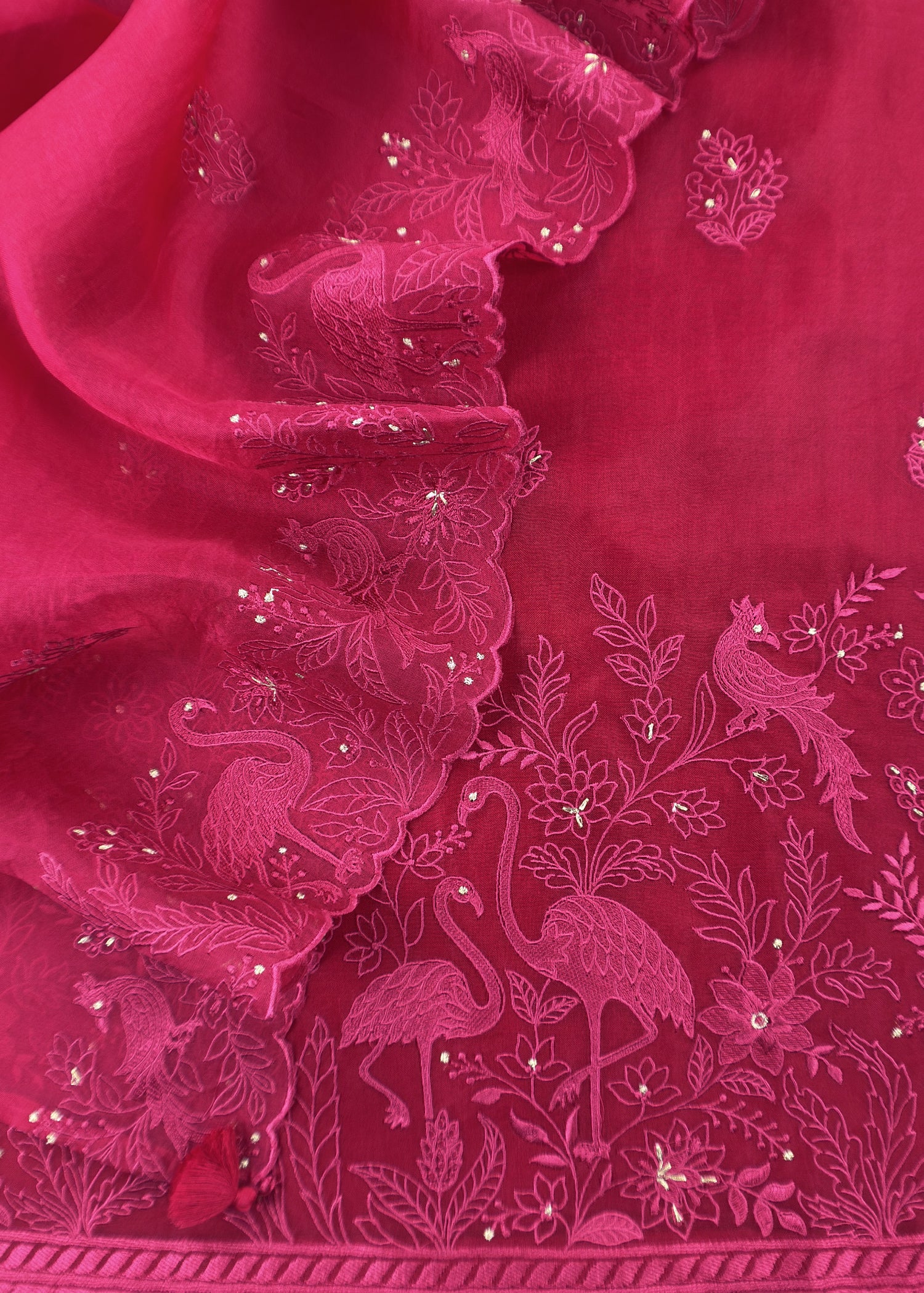 Rose Red Organza Silk Suit Fabric with Parsi Flamingo Embroidery