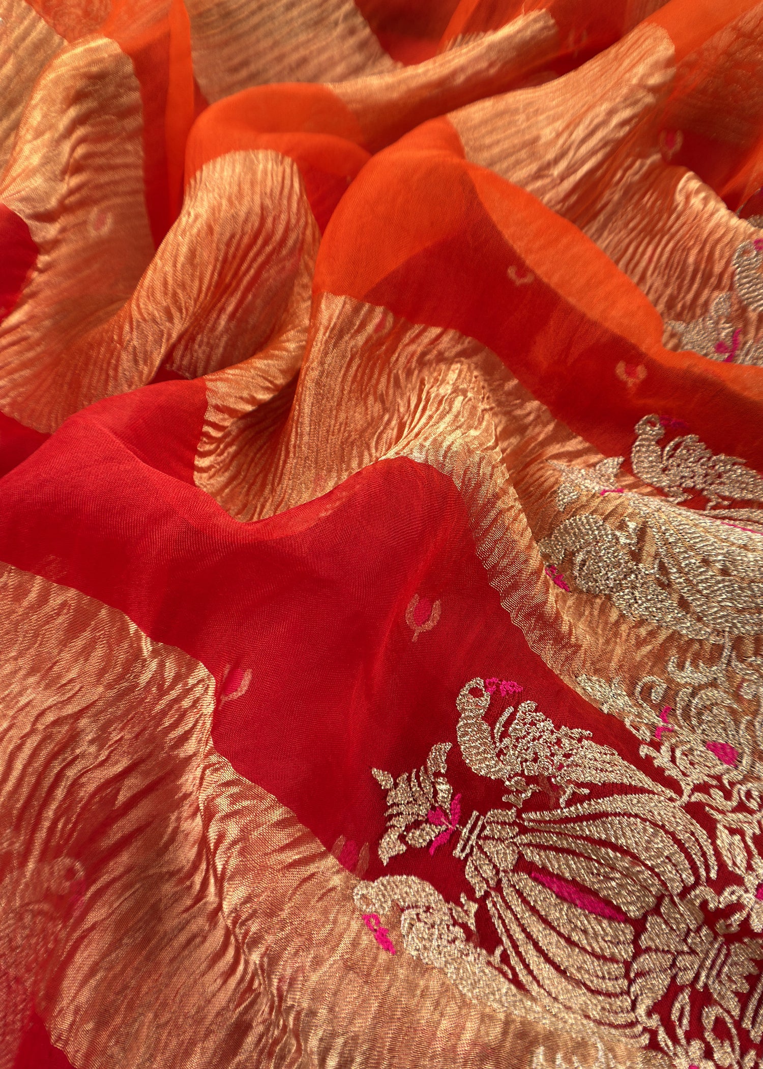 Shop Indian luxury pure kora silk kurta and double panel pure crushed tissue dupatta both adorned with gorgeous gold and Resham zari mor embroidery. The three piece suit fabric comes with matching crepe silk lowers.