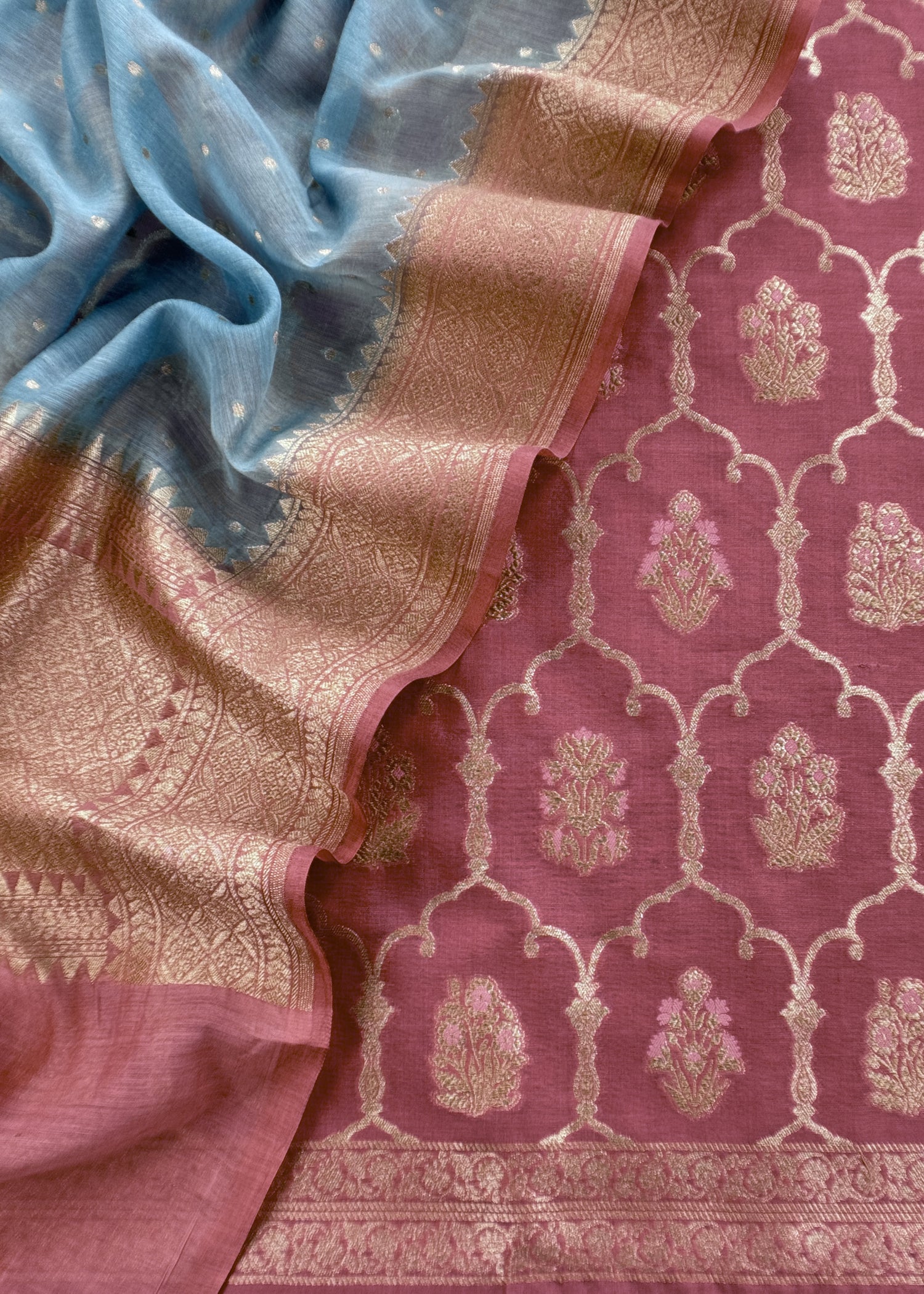 Pure Varanasi Silk kurta with woven phool jaal paired with pure Varanasi silk dupatta having elegant bootis bootis and fourside contrast borders paired with matching cotton satin lowers.