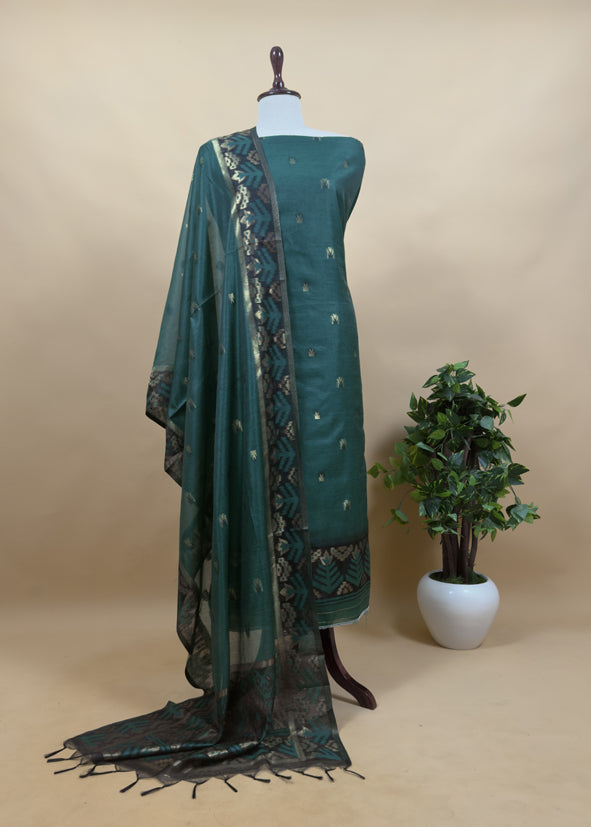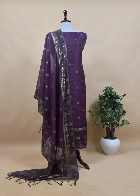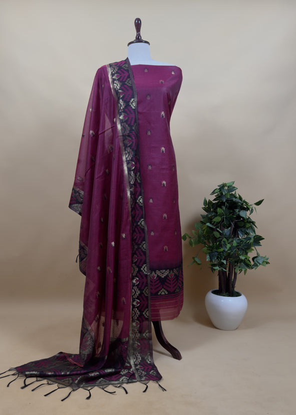 Shop three-piece chanderi silk suit fabric beautifully adorned with Jamdani weaving and gold zari weaving.