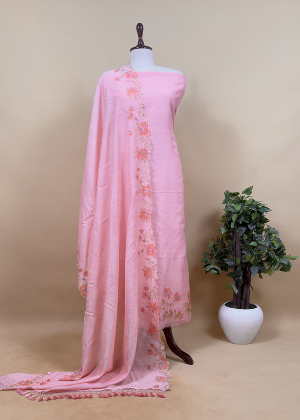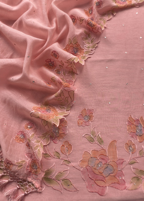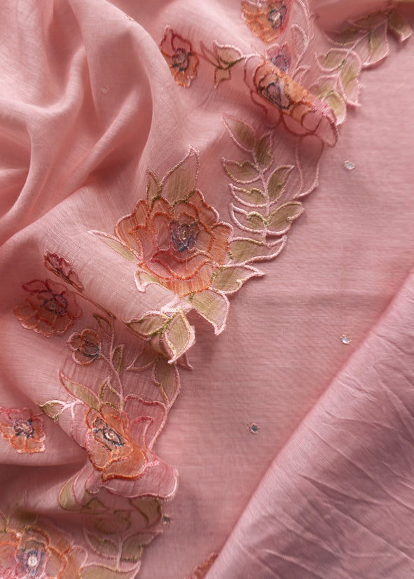 Salmon Pink Pure Mul Chanderi Suit With Mirror Embroidery
