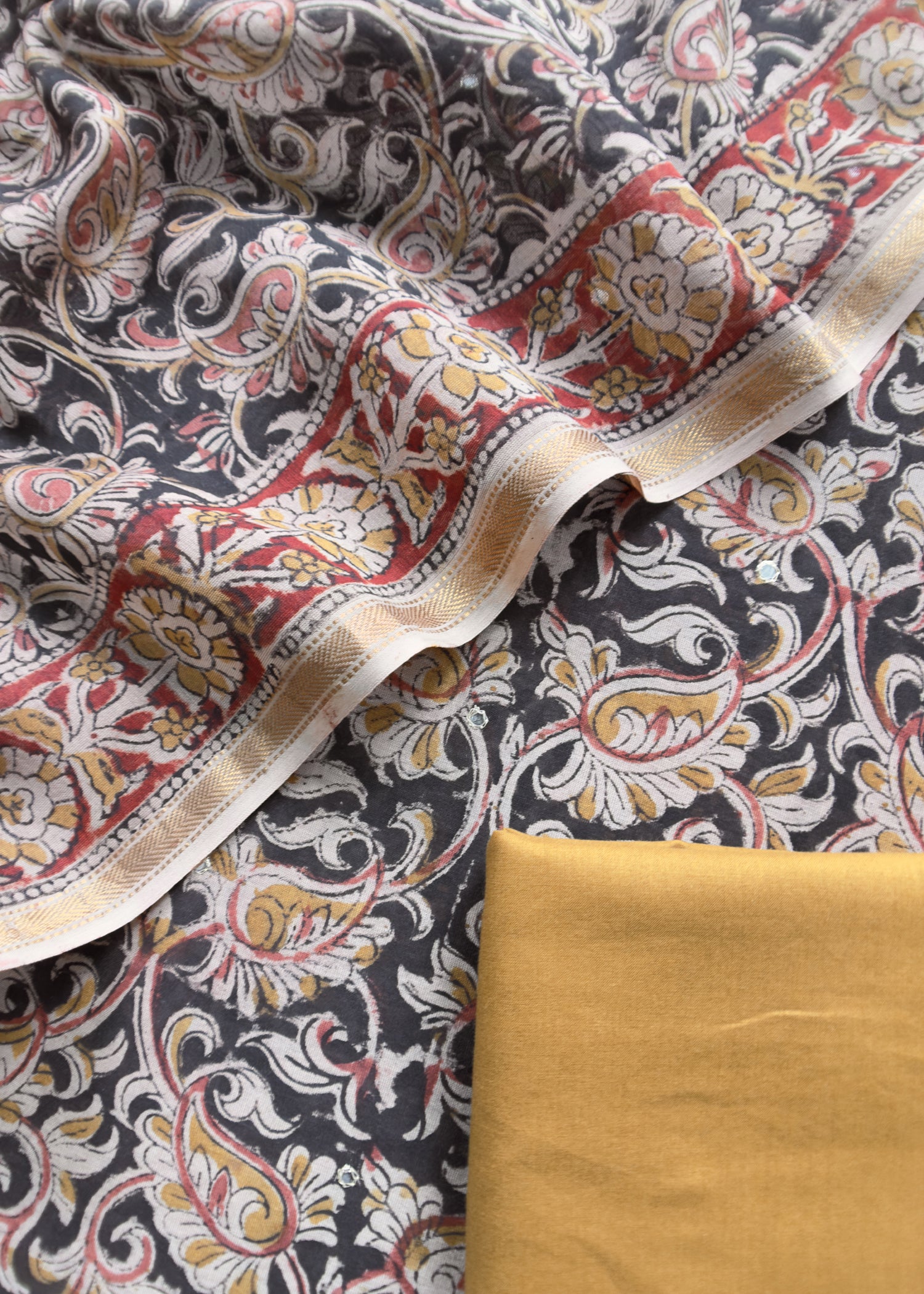 The Sanganeri hand-blocked Natural dyed suit fabric in pure Chanderi is embellished with elegant gota patti and mirror handwork along the neckline, with beautiful thread and mirror hand-embroidered motifs all over the kurta. This three-piece suit comes with a hand-blocked dupatta in pure Chanderi, complemented by plain printed cotton bottoms.