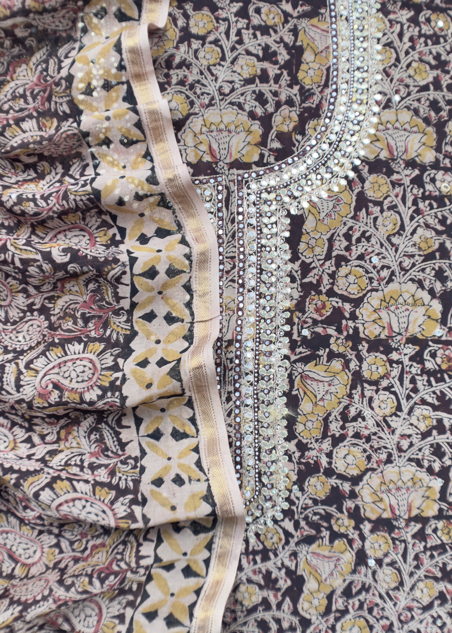 The Sanganeri hand-blocked Natural dyed suit fabric in pure Chanderi is embellished with elegant gota patti and mirror handwork along the neckline, with beautiful thread and mirror hand-embroidered motifs all over the kurta. This three-piece suit comes with a hand-blocked dupatta in pure Chanderi, complemented by plain printed cotton bottoms.