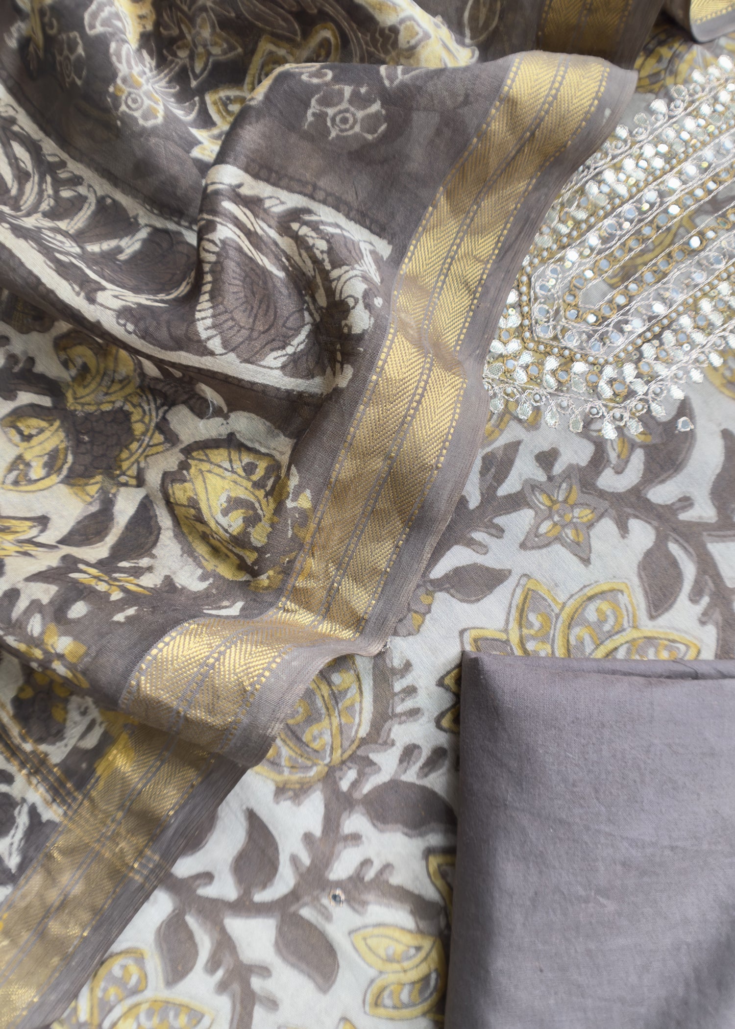 The Sanganeri hand-blocked Natural dyed suit fabric in pure Chanderi is embellished with elegant gota patti and mirror handwork along the neckline, with beautiful thread and mirror hand-embroidered motifs all over the kurta. This three-piece suit comes with a hand-blocked dupatta in pure Chanderi, complemented by plain printed cotton bottoms.