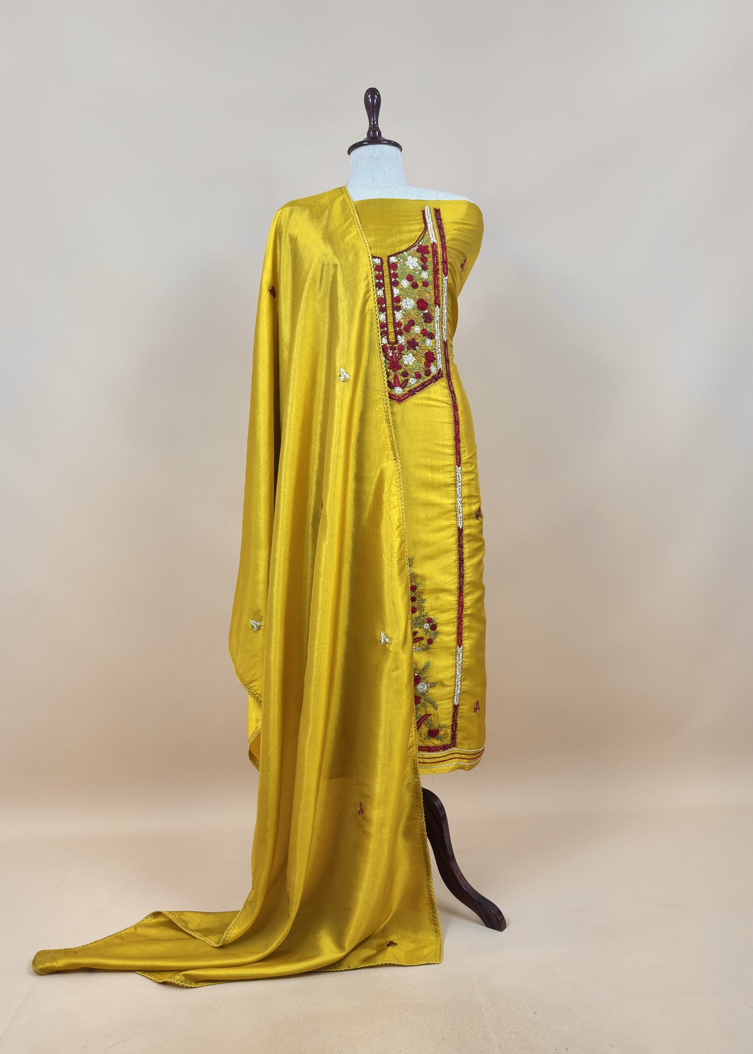Yellow Satin Silk Suit Fabric With French knot And Kantha Stitch Hand Embroidery