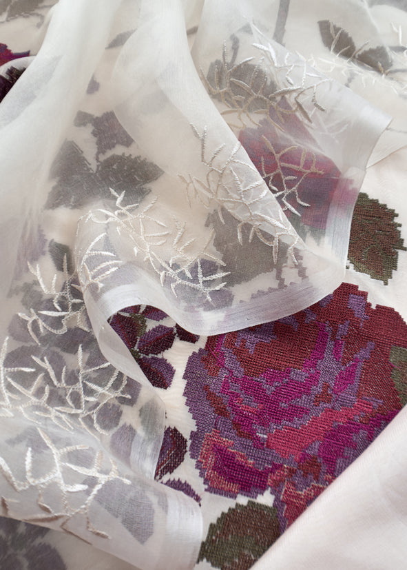 Dreamy garden of romance timelessly elegant handloom organza silk kurta and dupatta adorned with all over cross stitched embroidered roses and Ivory white resham four side borders with roses panel. The suit comes with matching crepe silk lowers.
