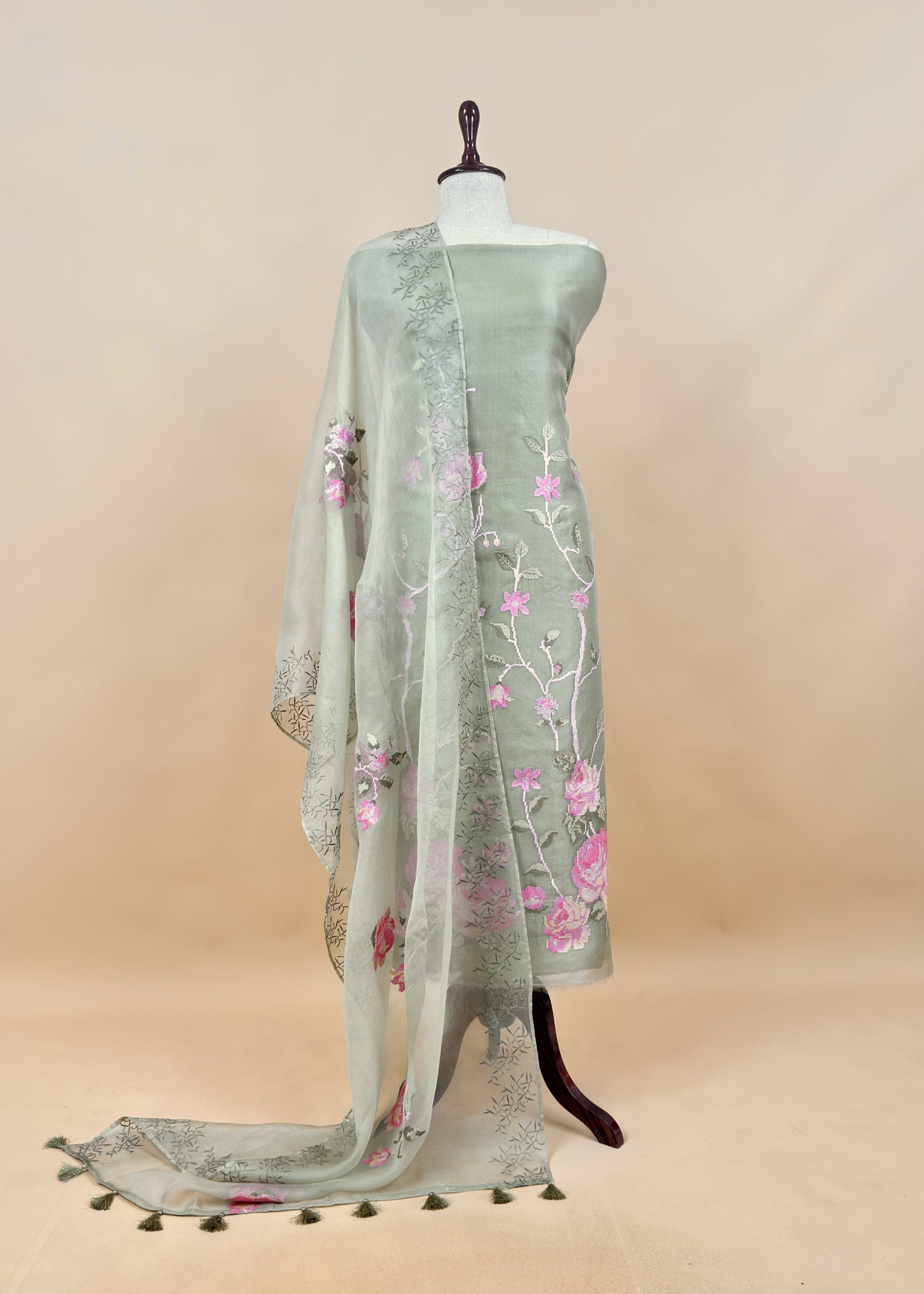 Dreamy garden of romance timelessly elegant handloom organza silk kurta and dupatta adorned with all over cross stitched embroidered roses and Ivory white resham four side borders with roses panel. The suit comes with matching crepe silk lowers.