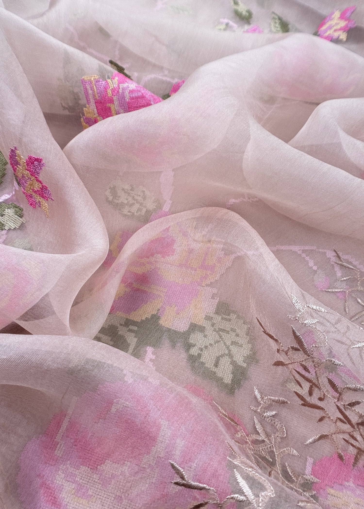 Senorita Dreamy Pink Handloom Organza Silk Suit Fabric With Cross-Stitch Embroidery