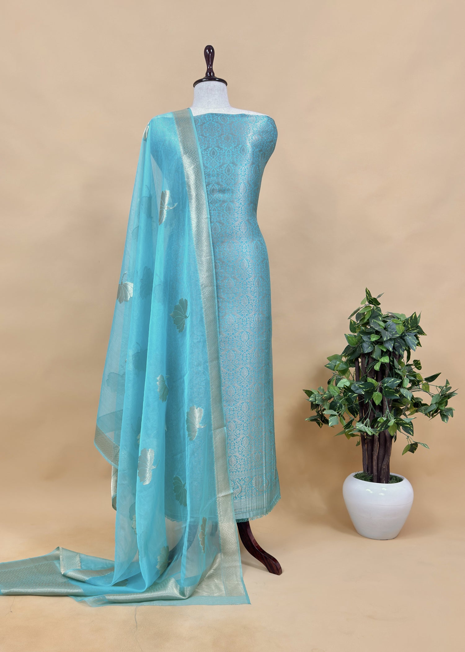 Sky Blue Banarasi Silk Brocade Suit With Organza Dupatta