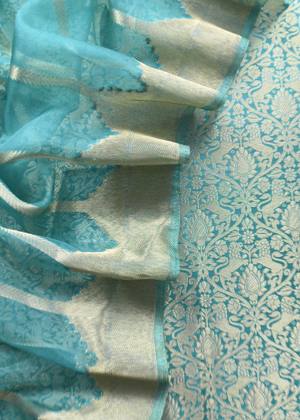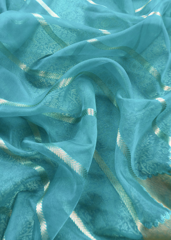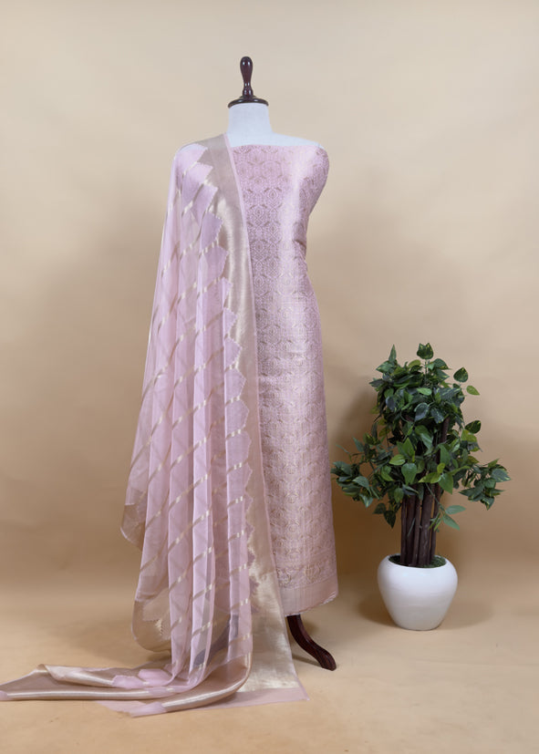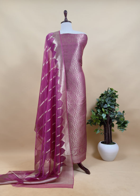 The wedding wear three-piece suit has brocade kurta and organza Dupatta adorned with beautiful golden zari work along with plain crepe bottom.