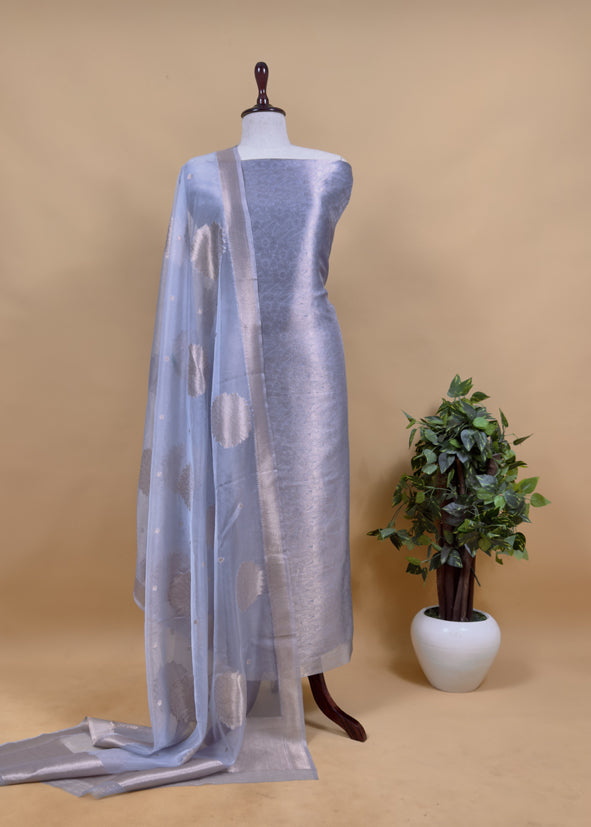 Sky Blue Tissue Brocade Silk Unstitched Suit With Zari Weaving