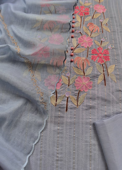 Steel Blue Embroidered Cotton Suit With Kota Dupatta