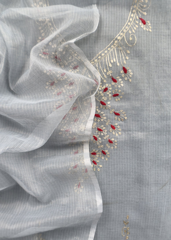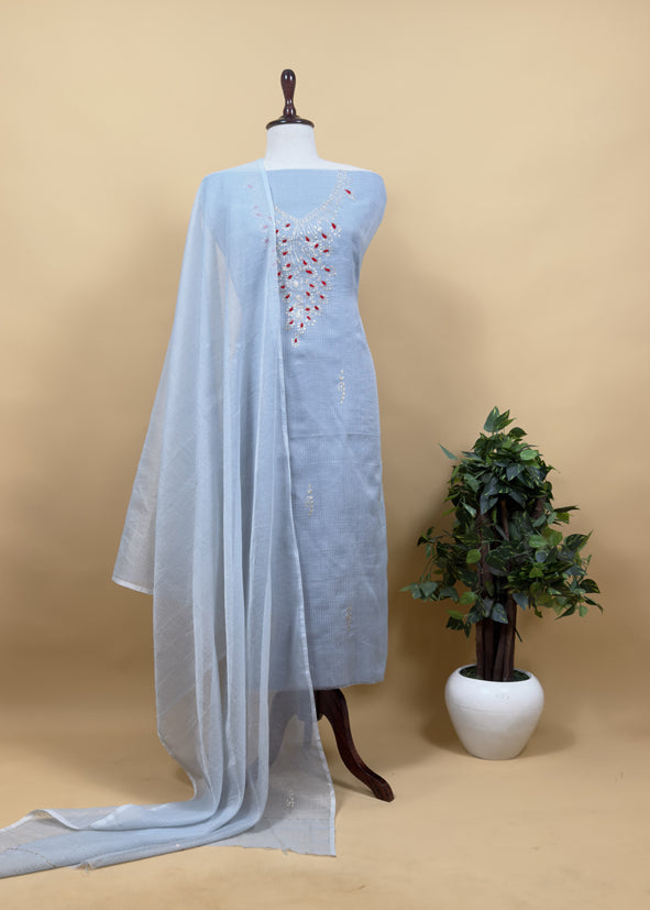 Steel Blue Kota Doria Dupatta Suit With Pitta Work