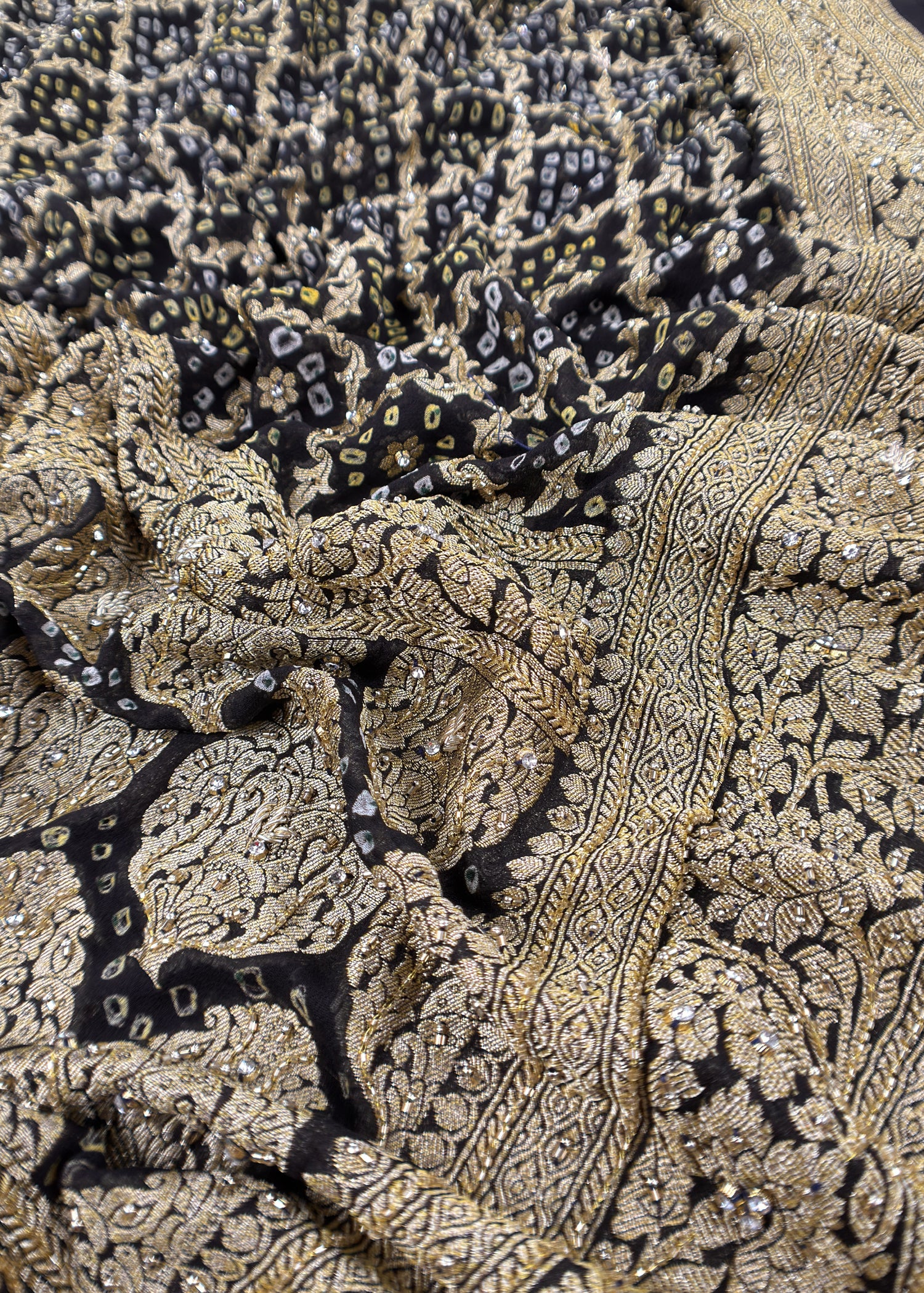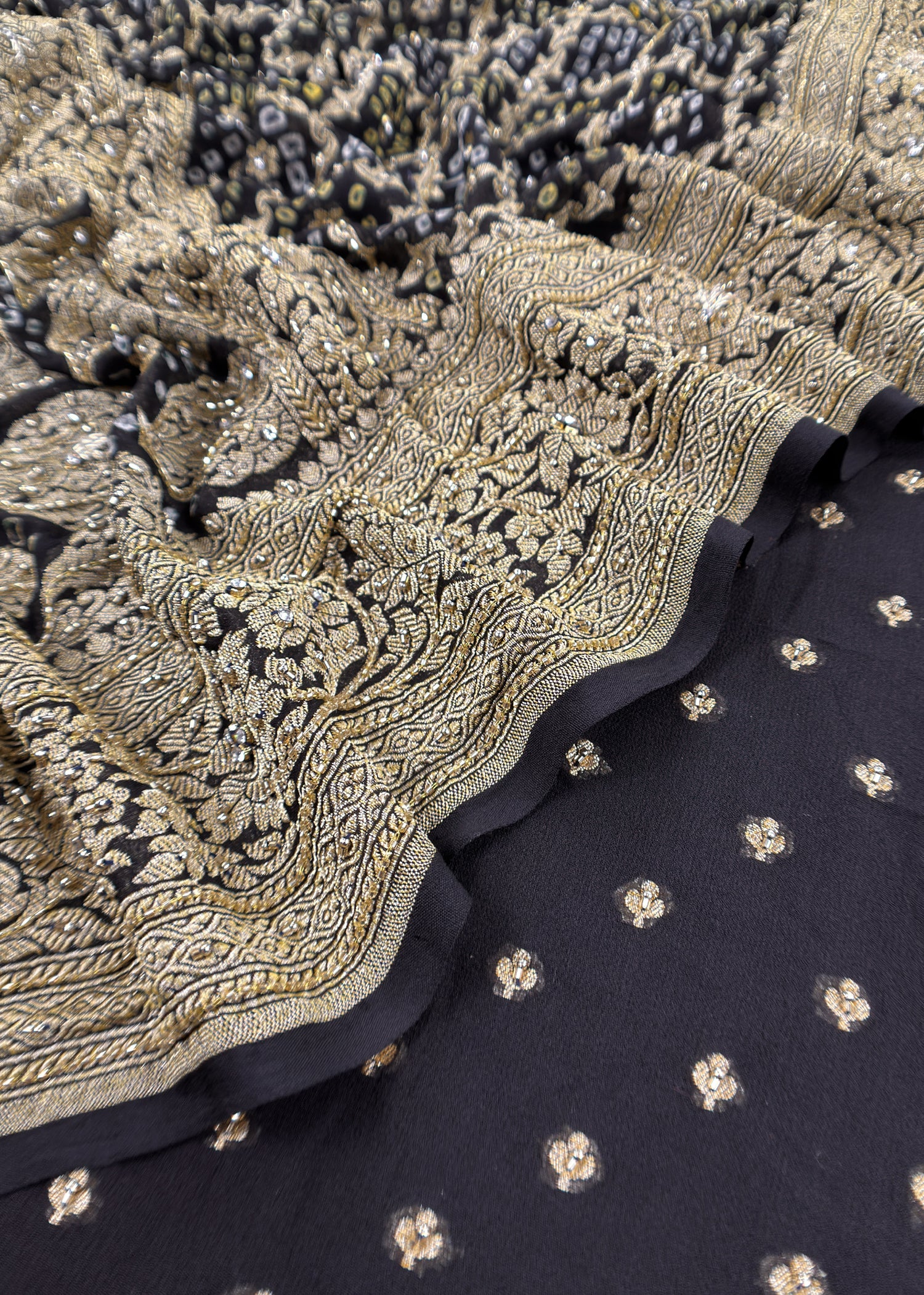Surkh Black Luxe Handloom Khaddi Georgette Bandhani Suit Fabric With Handwork
