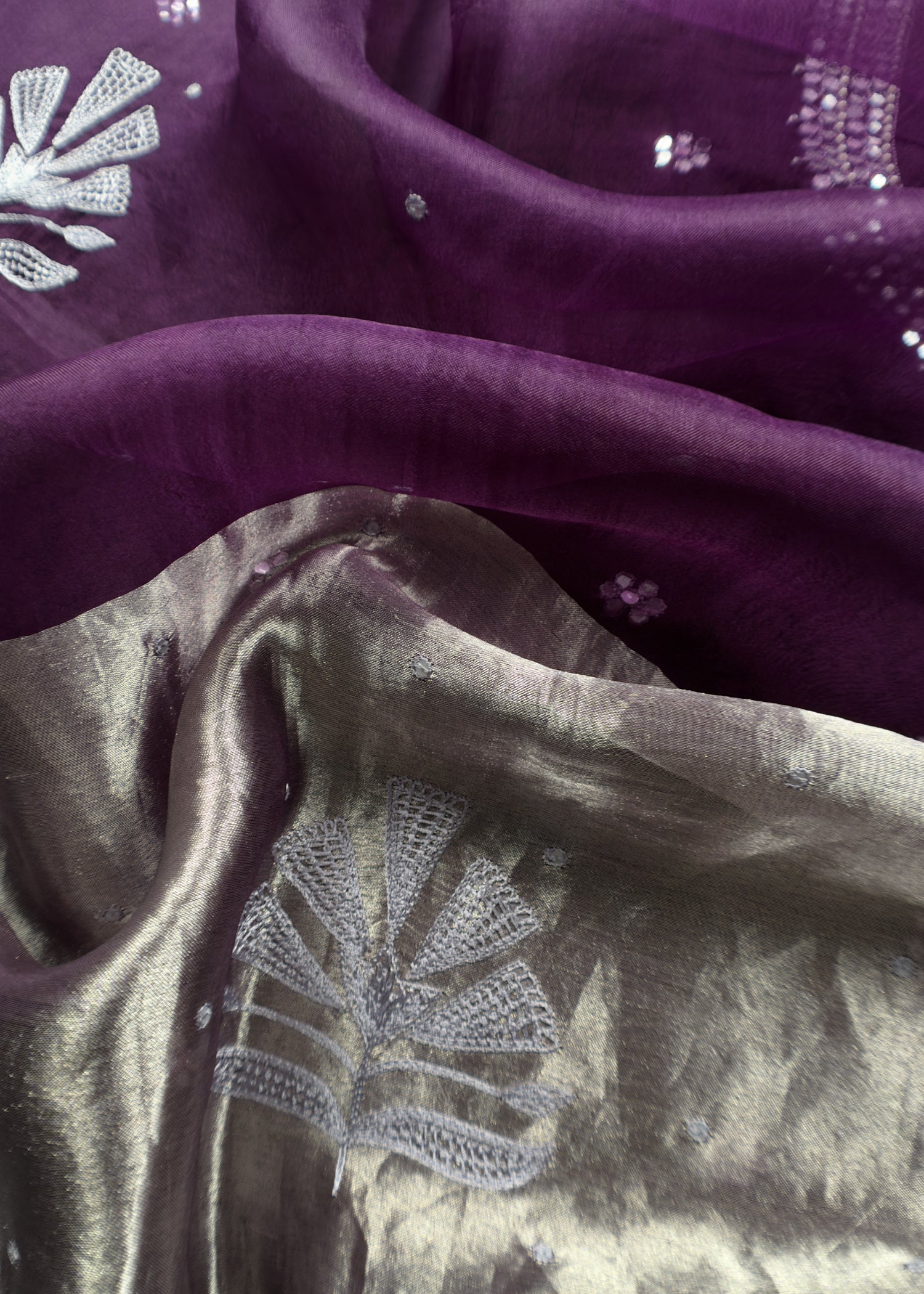 Violet Handloom kora Silk Suit with Mirror Handwork And Embroidery