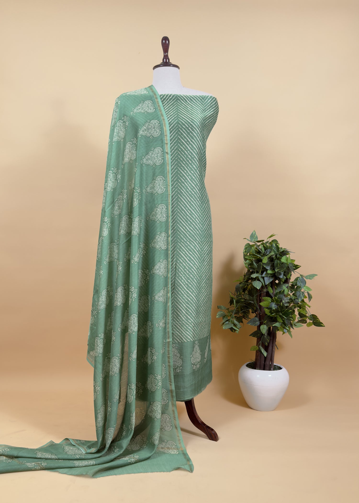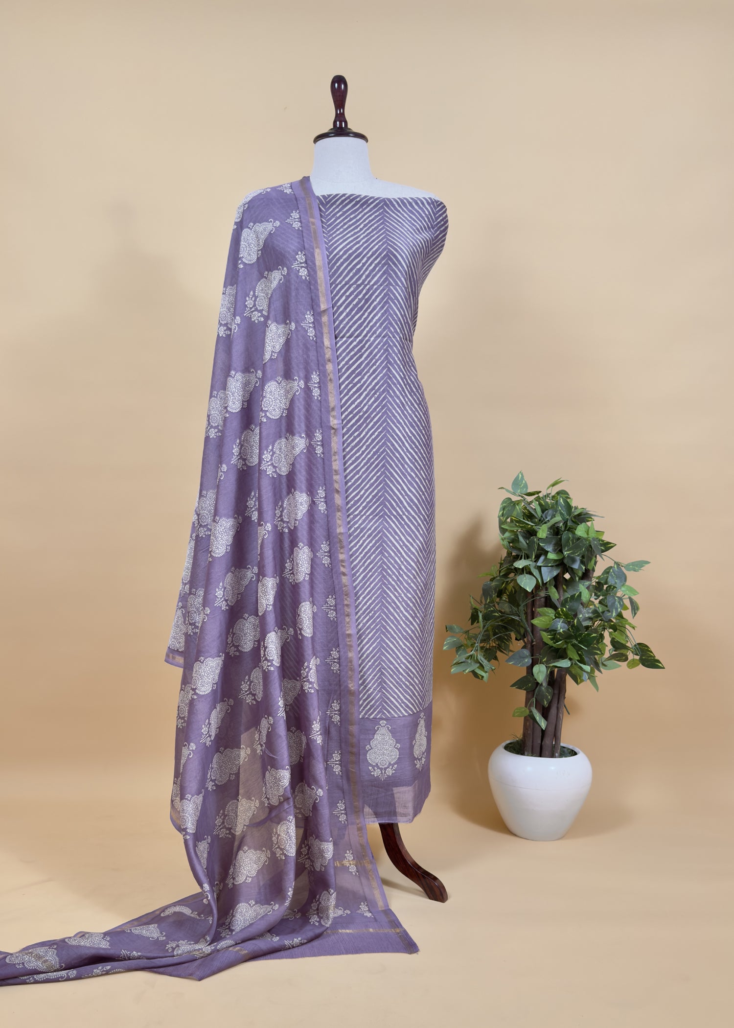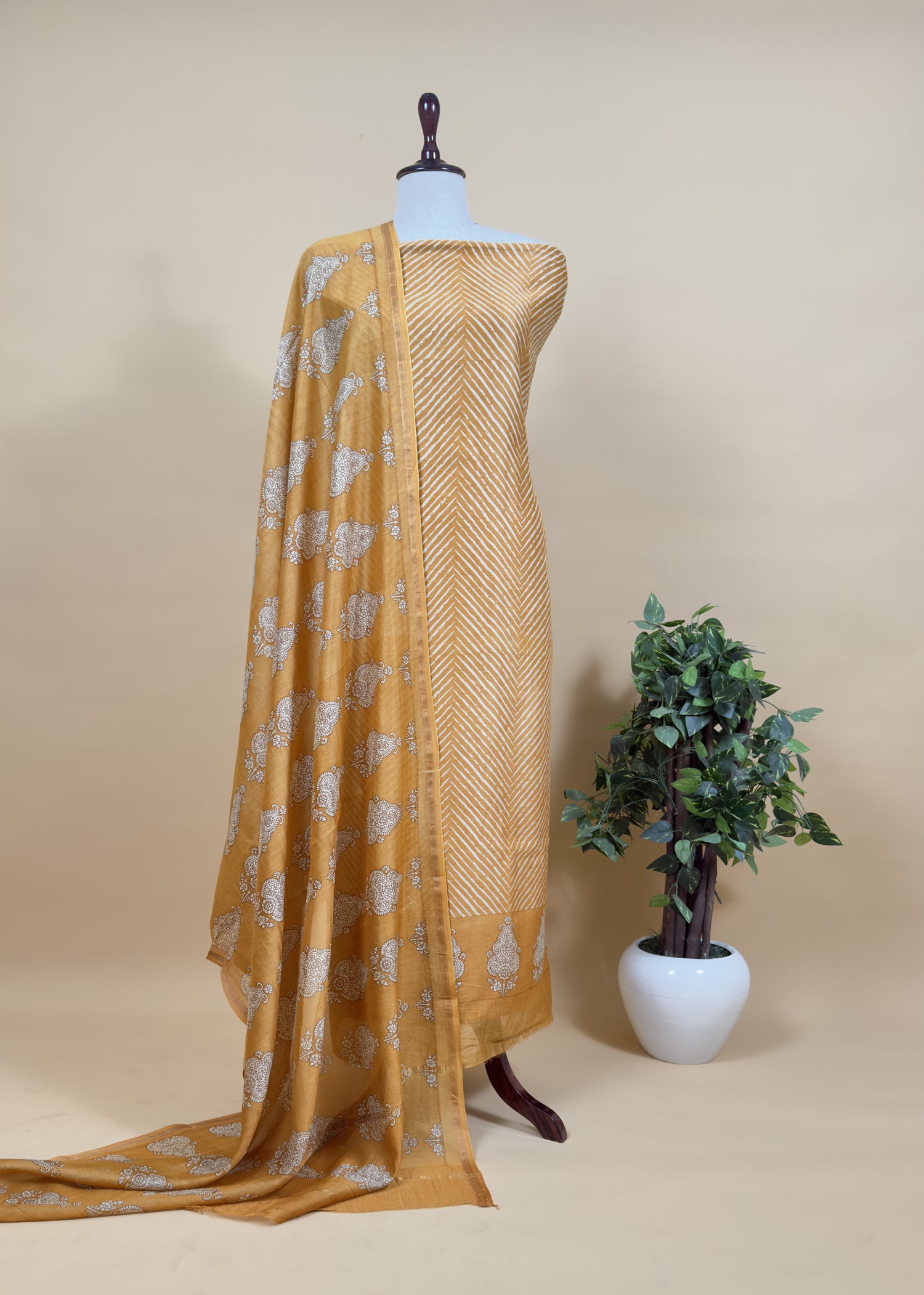 Pure Maheshwari kurta and dupatta adorned with Leheriya and Block print are paired with plain satin cotton bottoms.