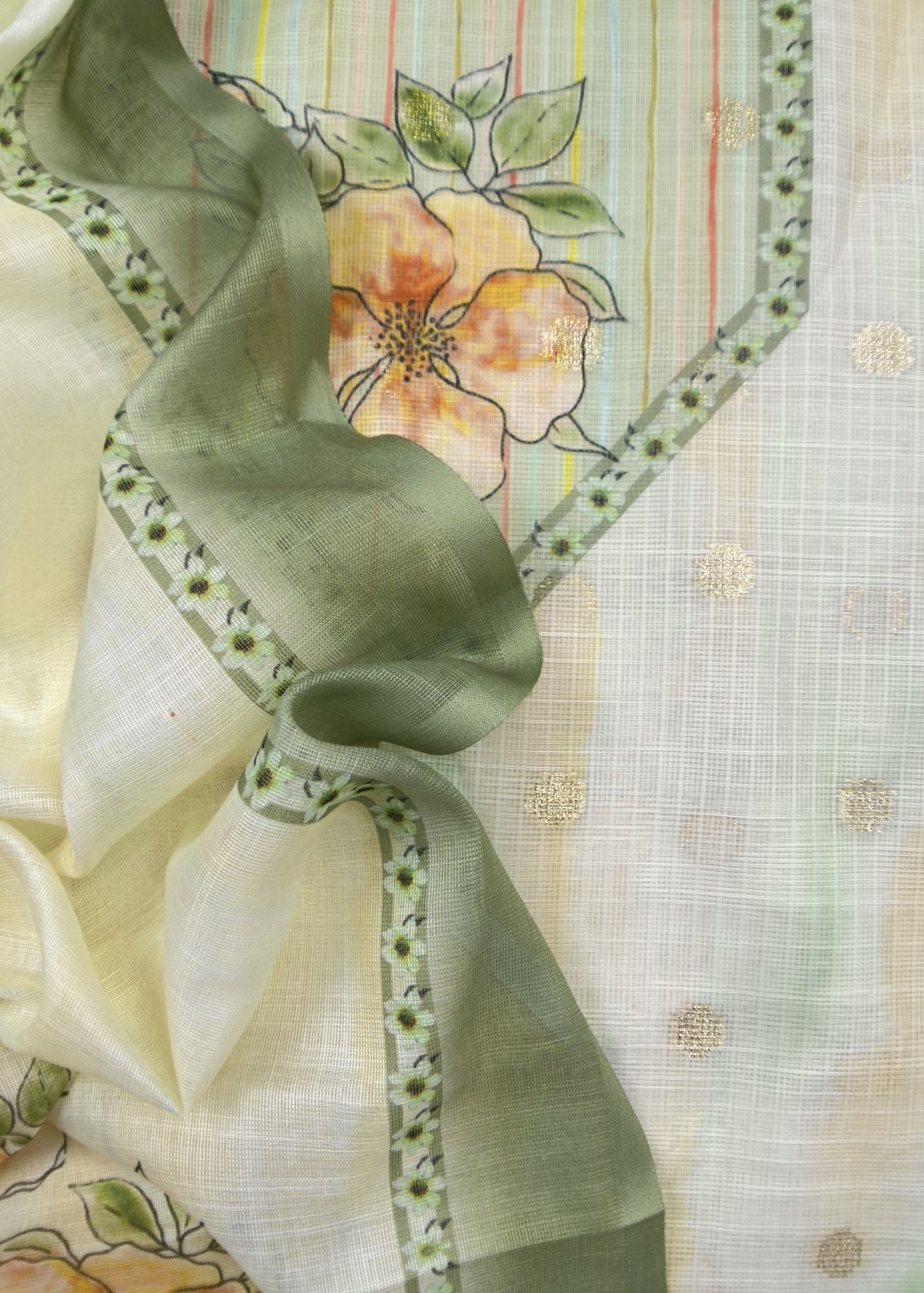 White And Green Foral Chanderi Blend Unstitched Suit With Zari Weaving