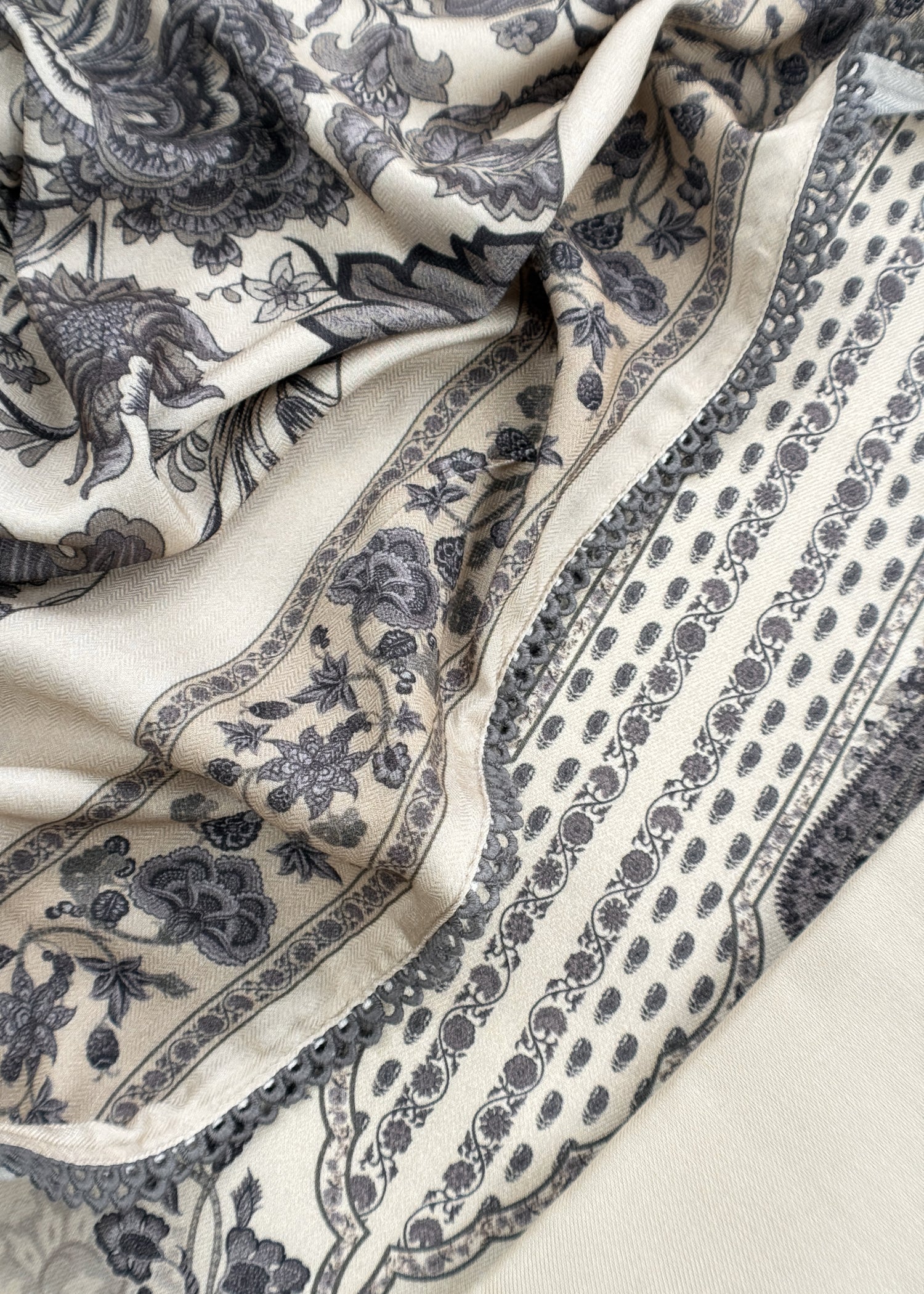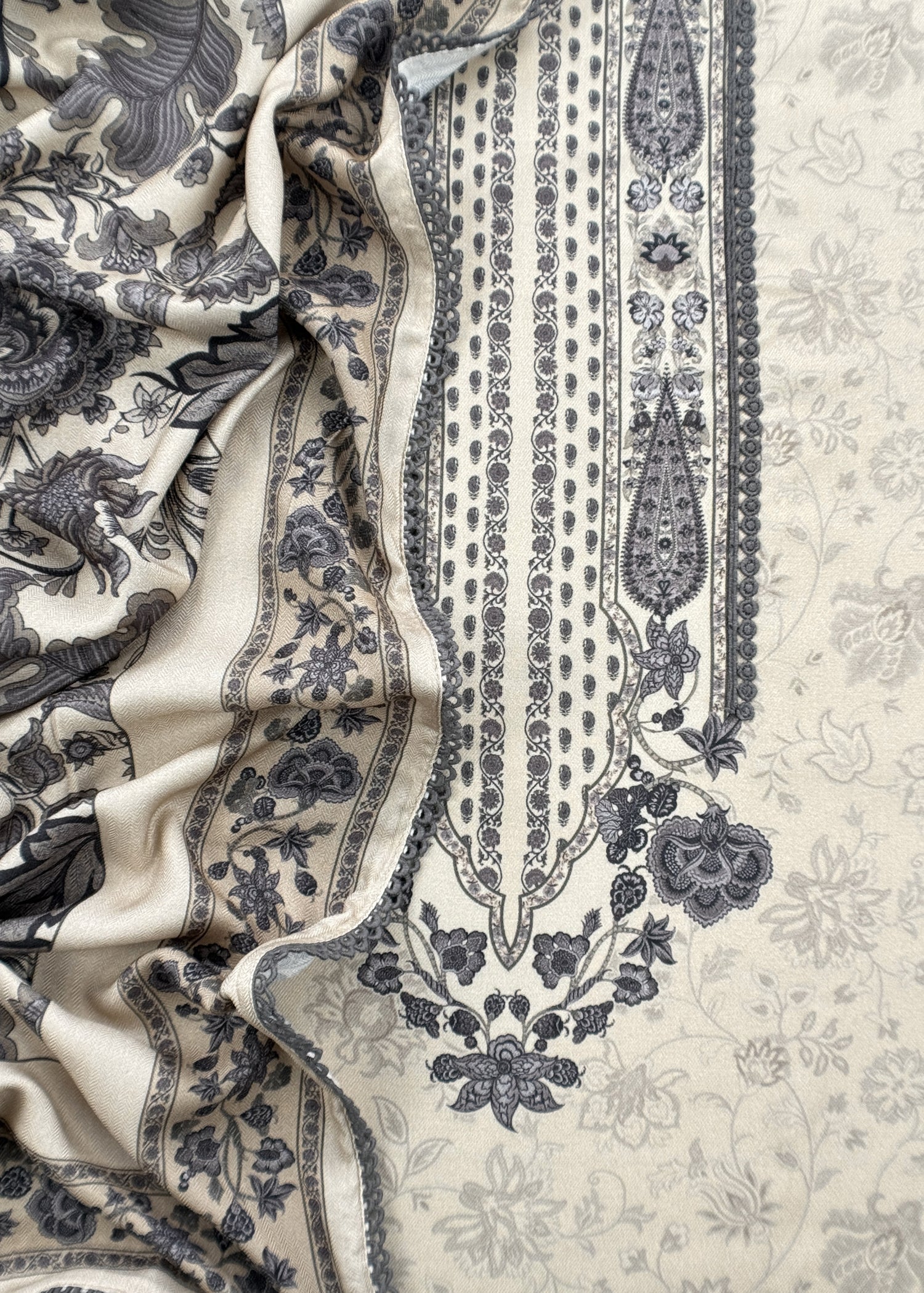 White And Grey Winters Spun Pashmina Digital Print Suit Fabric