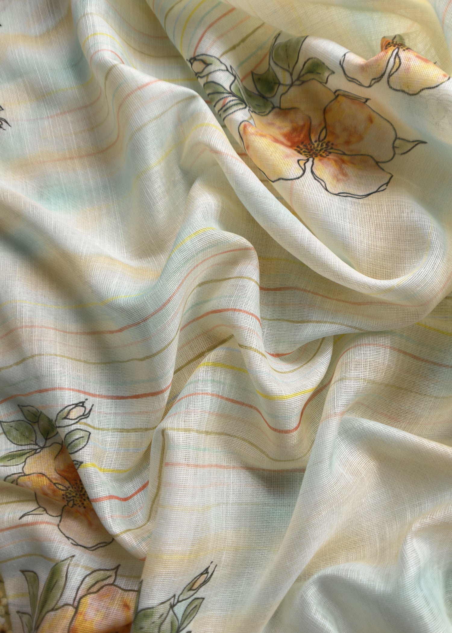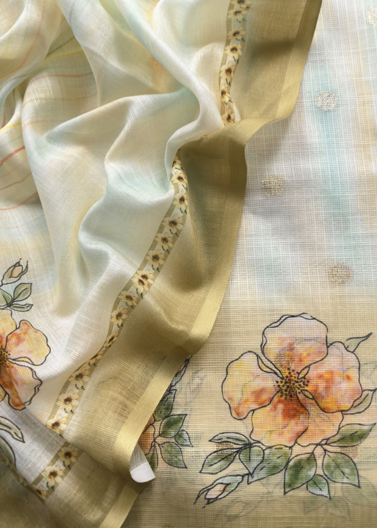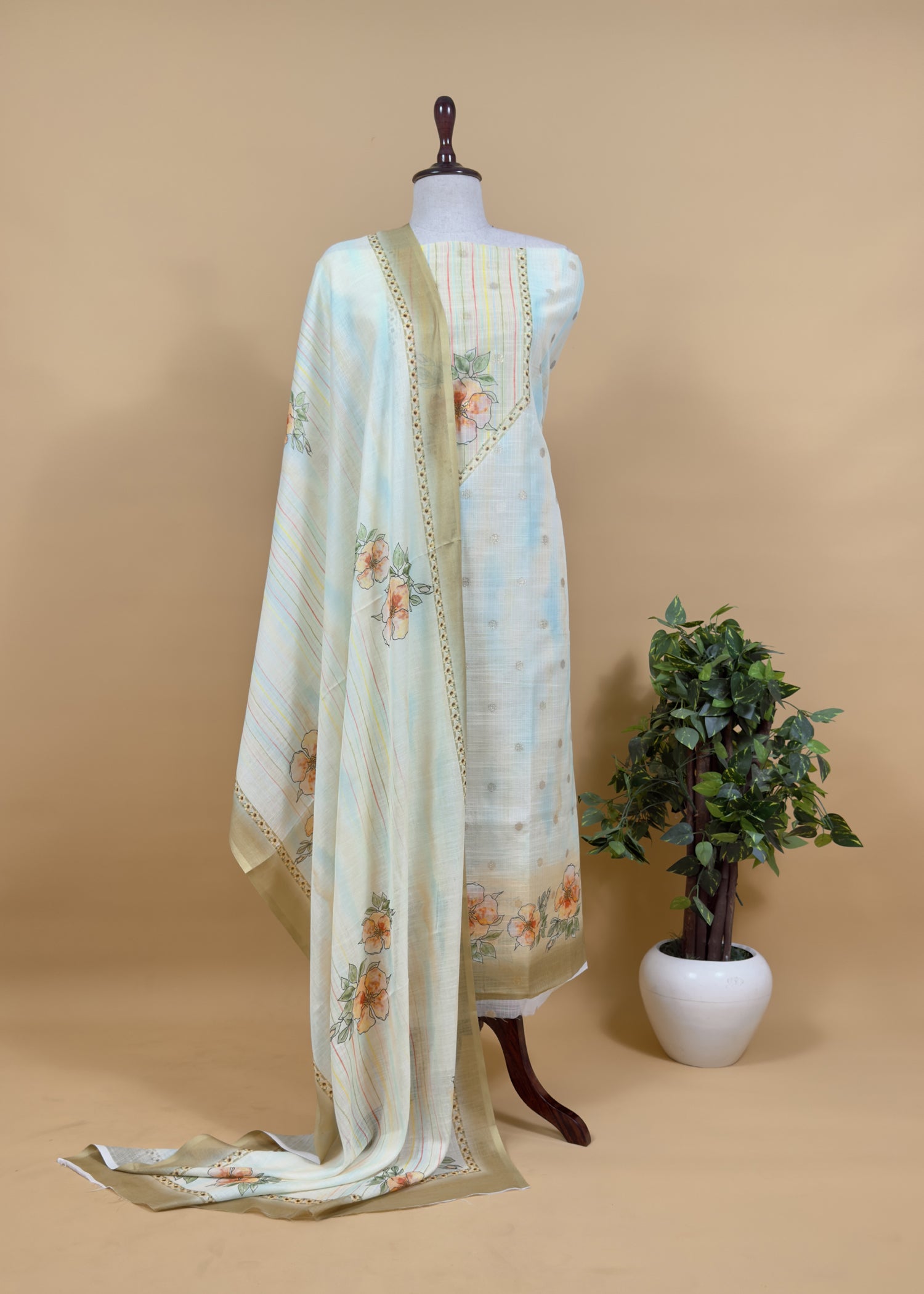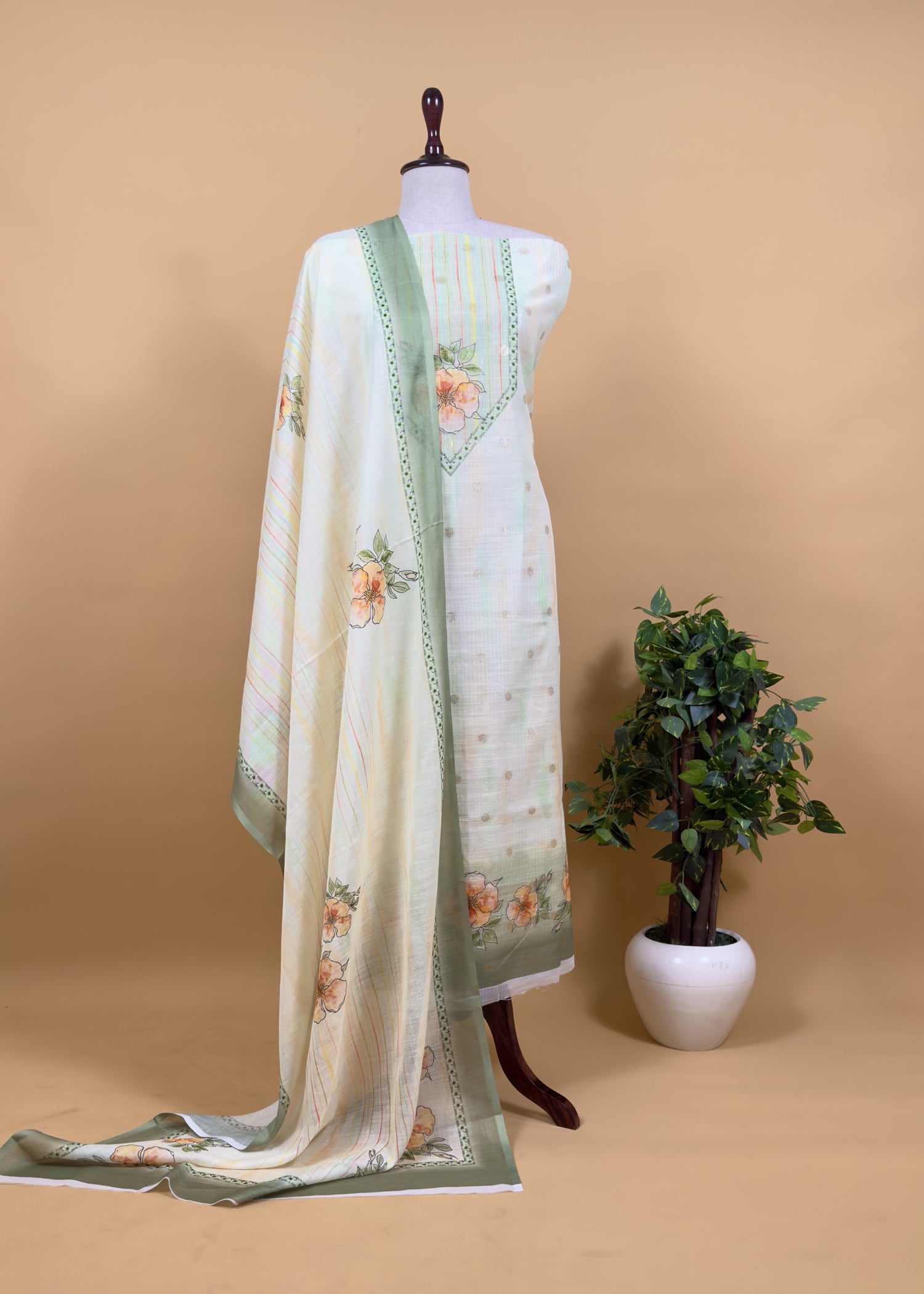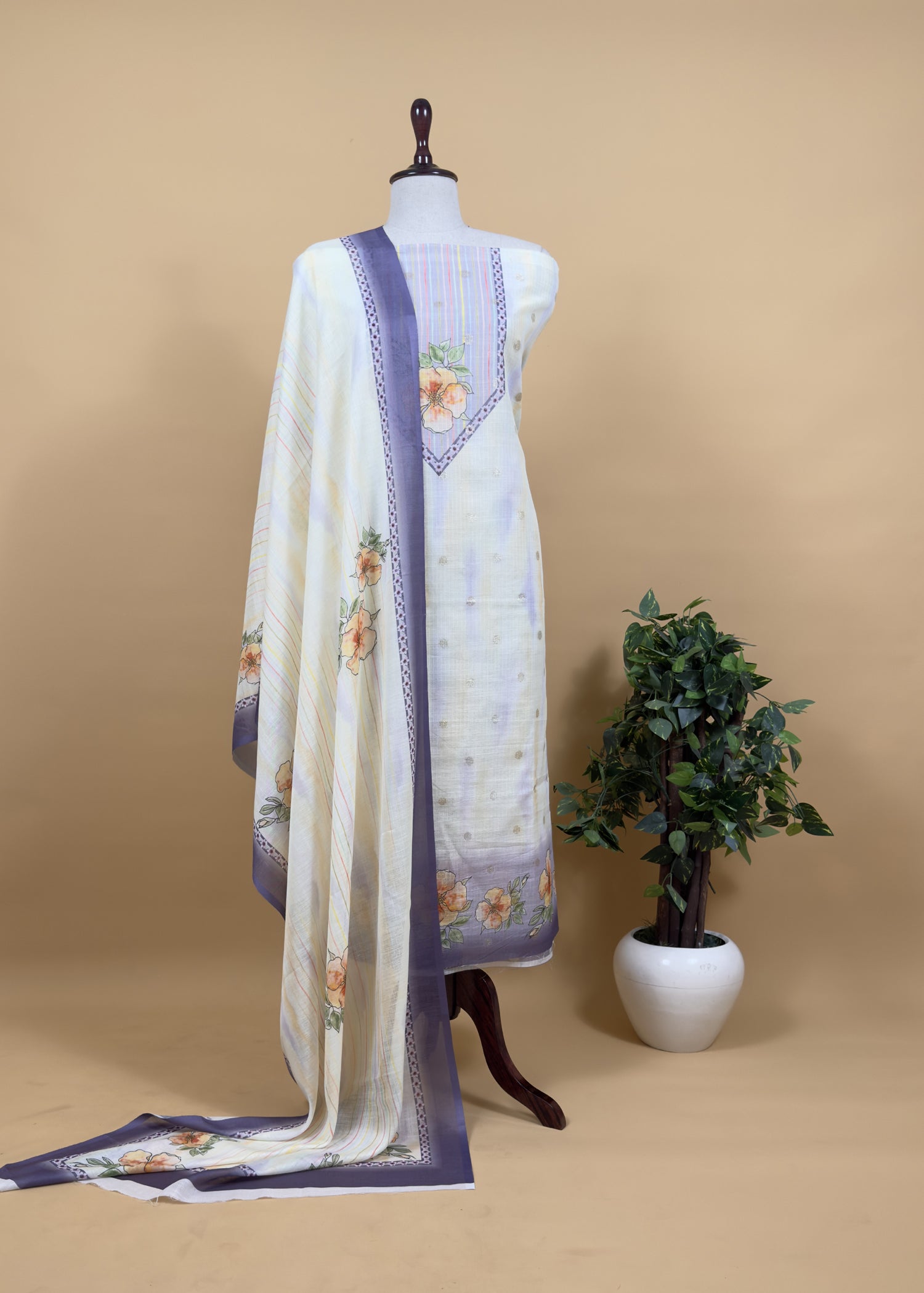 White And Mustard Foral Chanderi Blend Unstitched Suit With Zari Weaving
