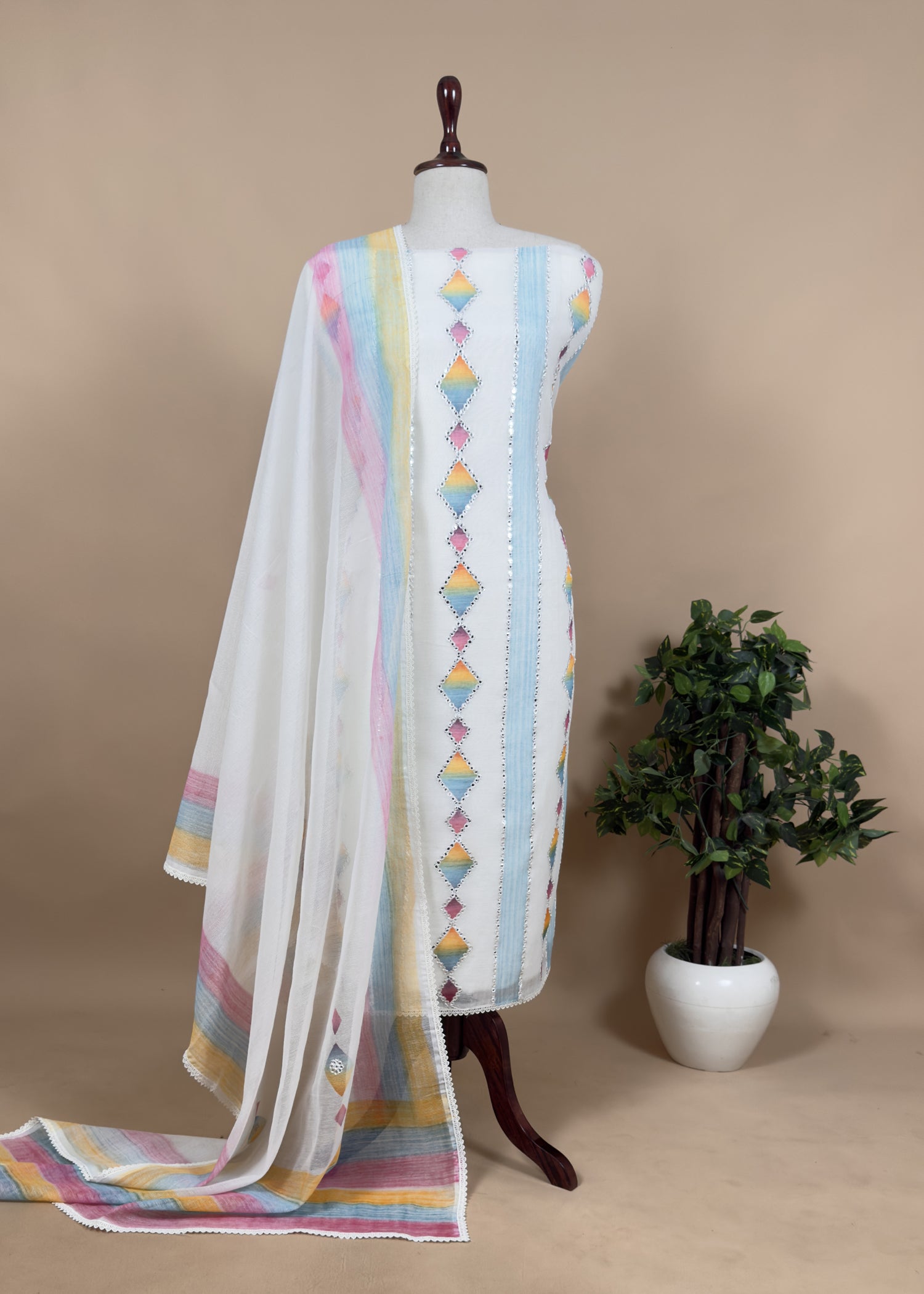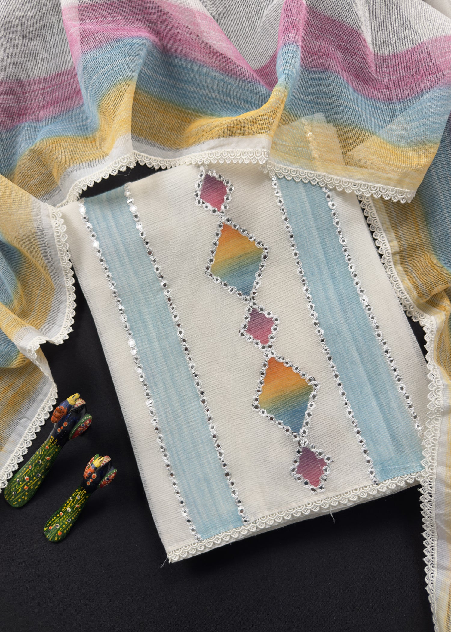 Kota doria suit embellished with colorful embroidered patchwork through out the kurta and dupatta and plain cotton bottom.