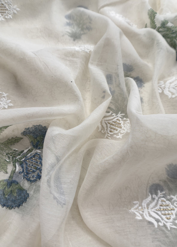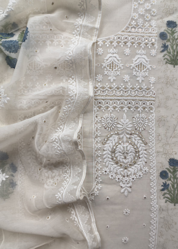 White With Blue Pure Mul Handblock Print Suit With Chikan Embroidery