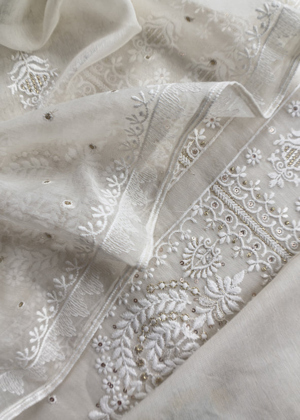 All over hand-block print kurta and dupatta in summer handloom mul fabric with beautiful machine Chikankari embroidery and gold detailings on the front panel of kurta and borders of dupatta. The three piece suit comes with matching cotton satin bottom.