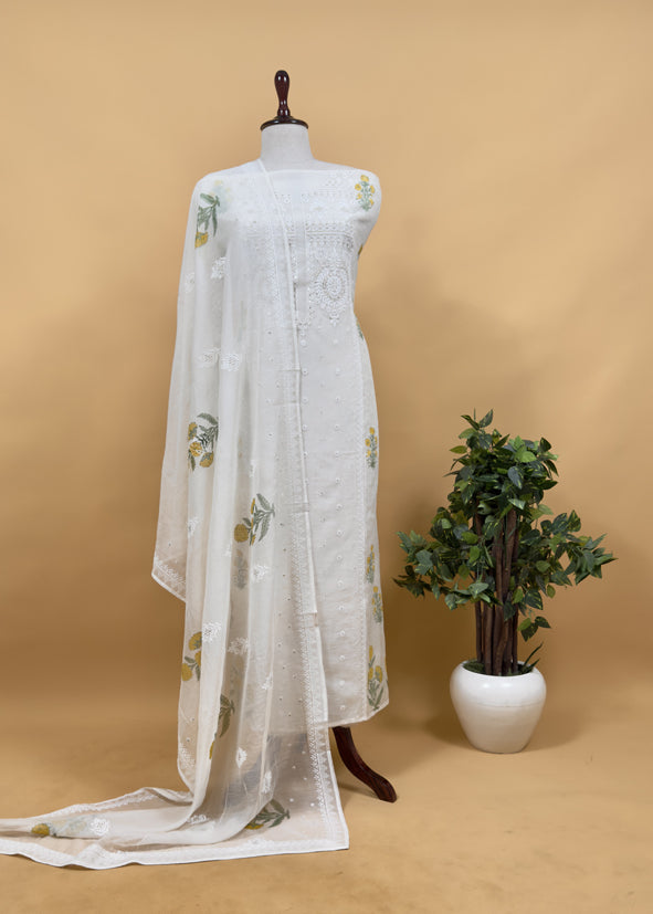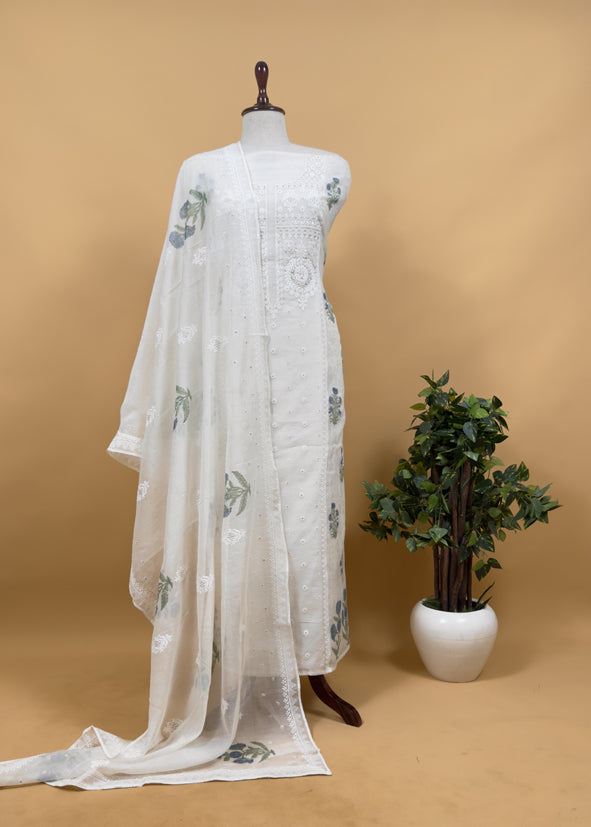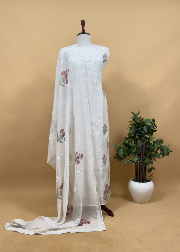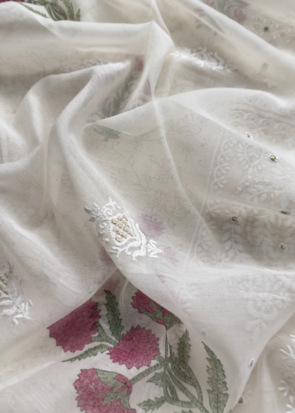 White With Pink Pure Mul Handblock Print Suit With Chikan Embroidery