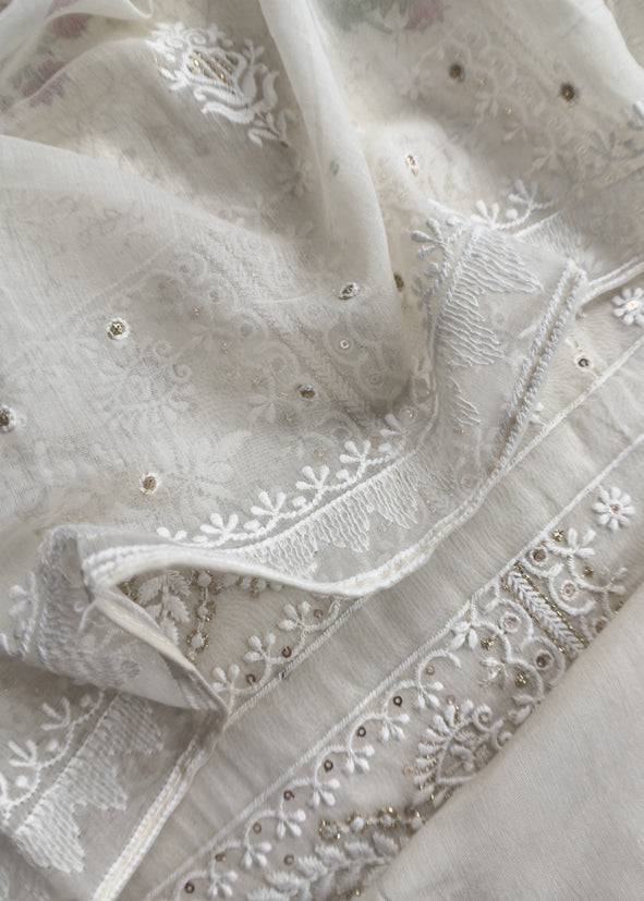 All over hand-block print kurta and dupatta in summer handloom mul fabric with beautiful machine Chikankari embroidery and gold detailings on the front panel of kurta and borders of dupatta. The three piece suit comes with matching cotton satin bottom.
