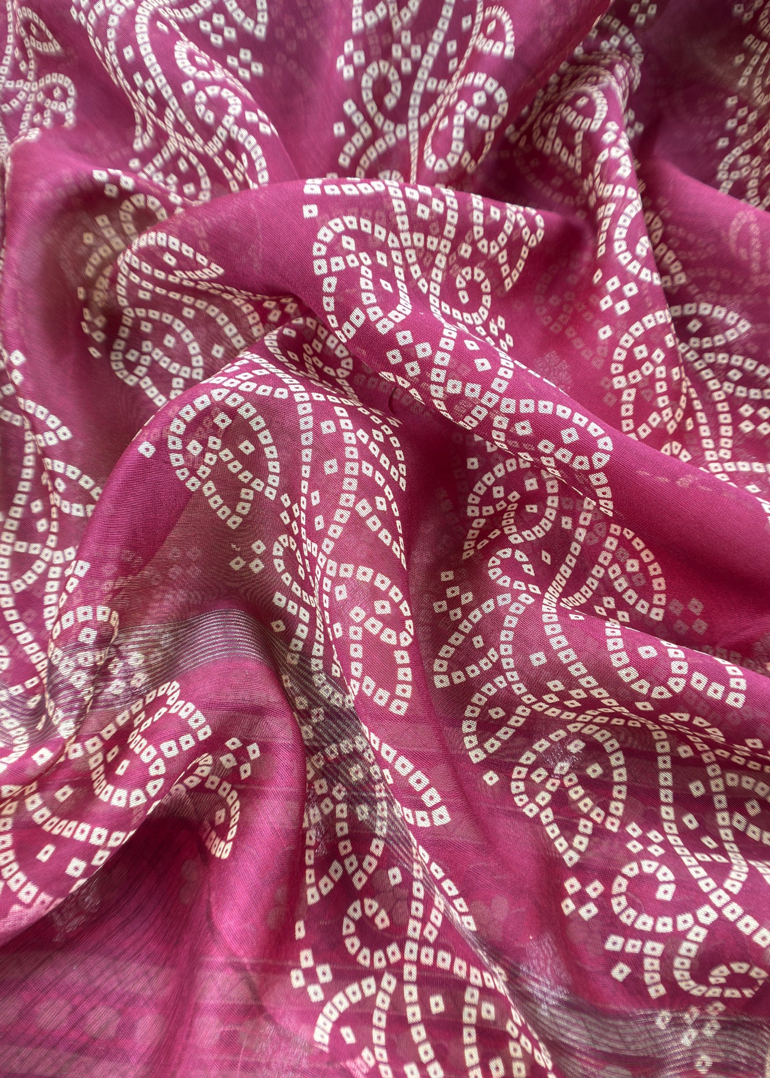 Pure Maheshwari kurta and dupatta, adorned with traditional bhandhani print and Banarasi gold weaving bootis, paired with plain satin cotton bottoms.
