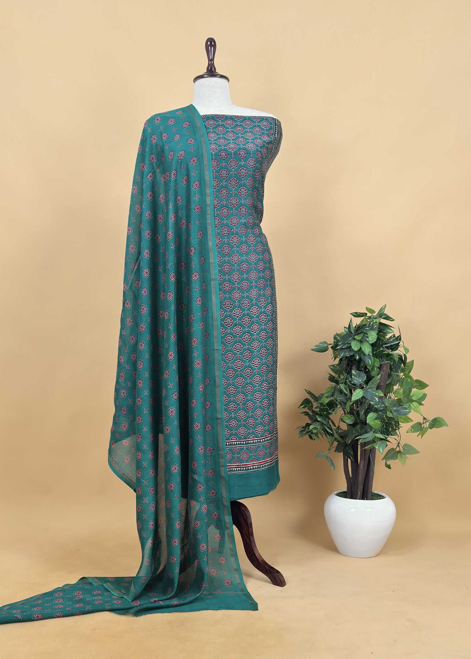 A pure Maheshwari silk Ajrakh kurta and dupatta paired with plain satin cotton bottoms. This Maheshwari silk suit is your perfect choice for festive occasions and wedding celebrations.