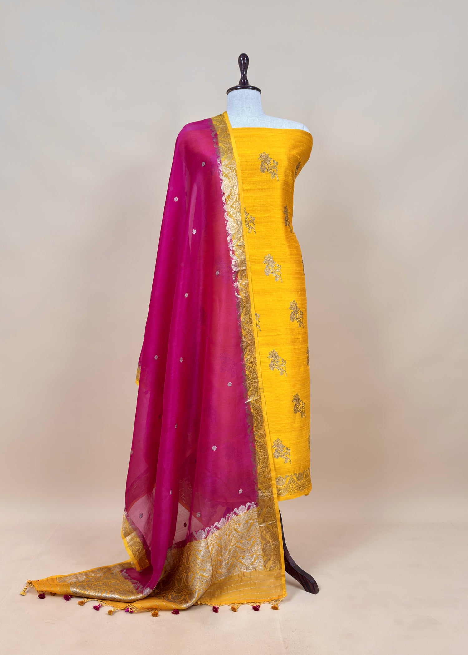 Yellow and Pink Handloom Raw Silk Suit With Kora Silk Dupatta