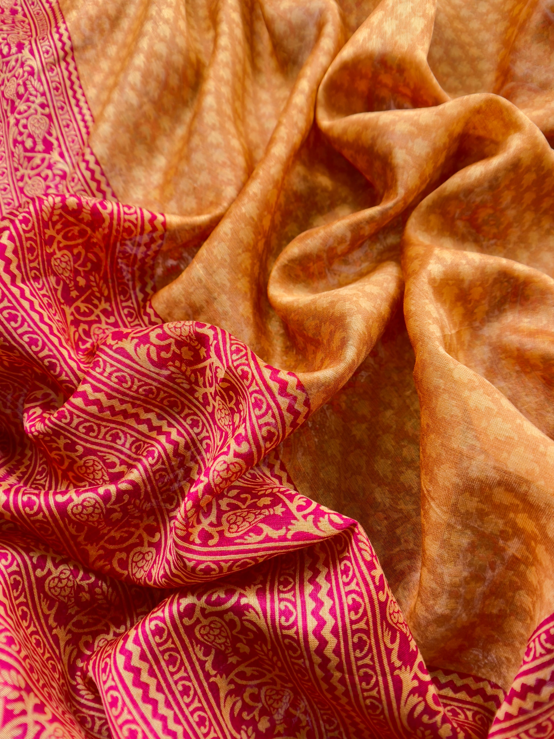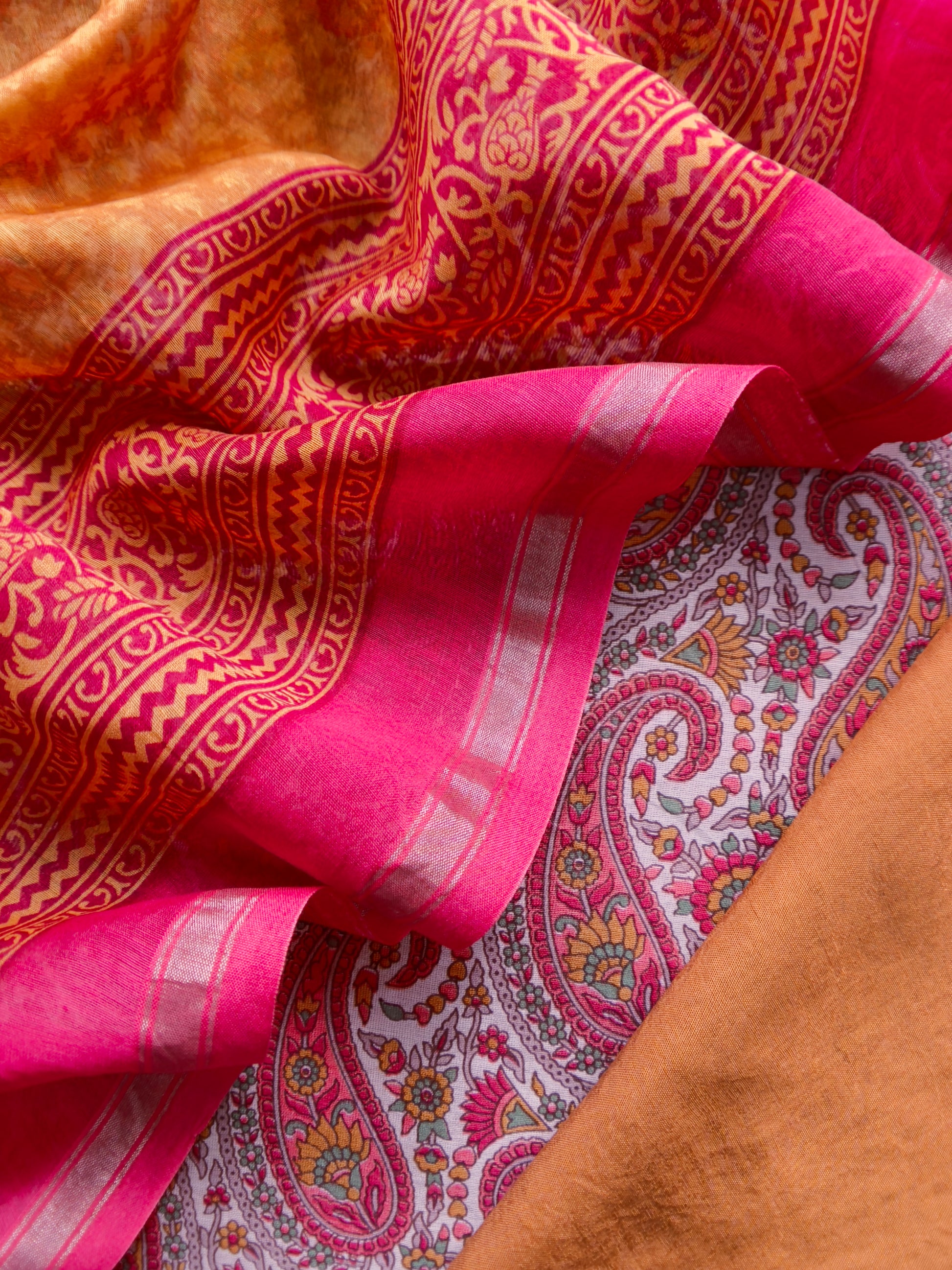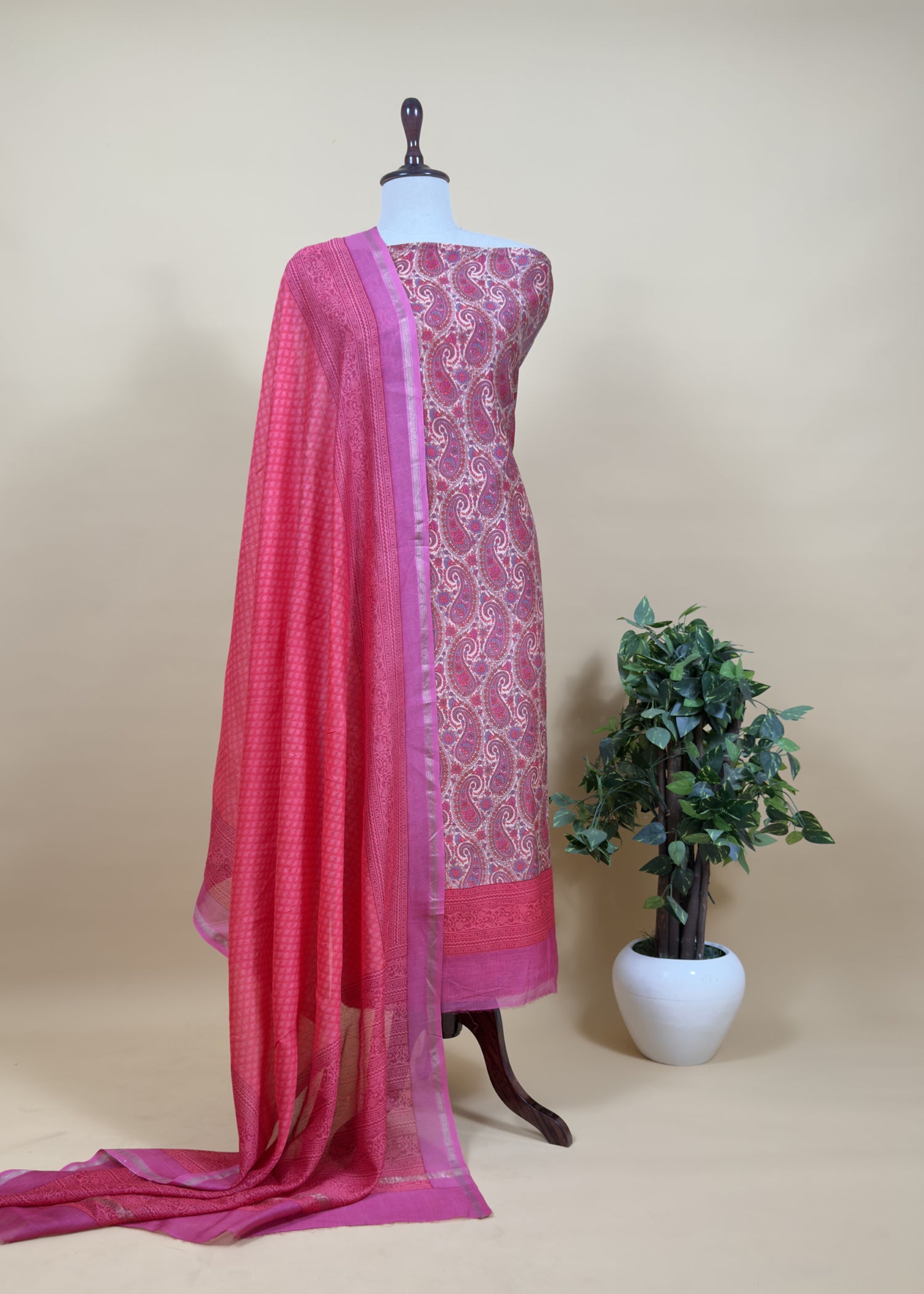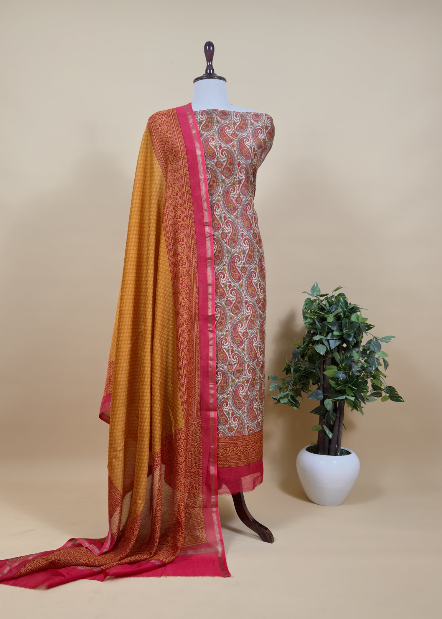 Yellow and Red Paisley Block Print Pure Maheshwari Silk Unstitched Suit