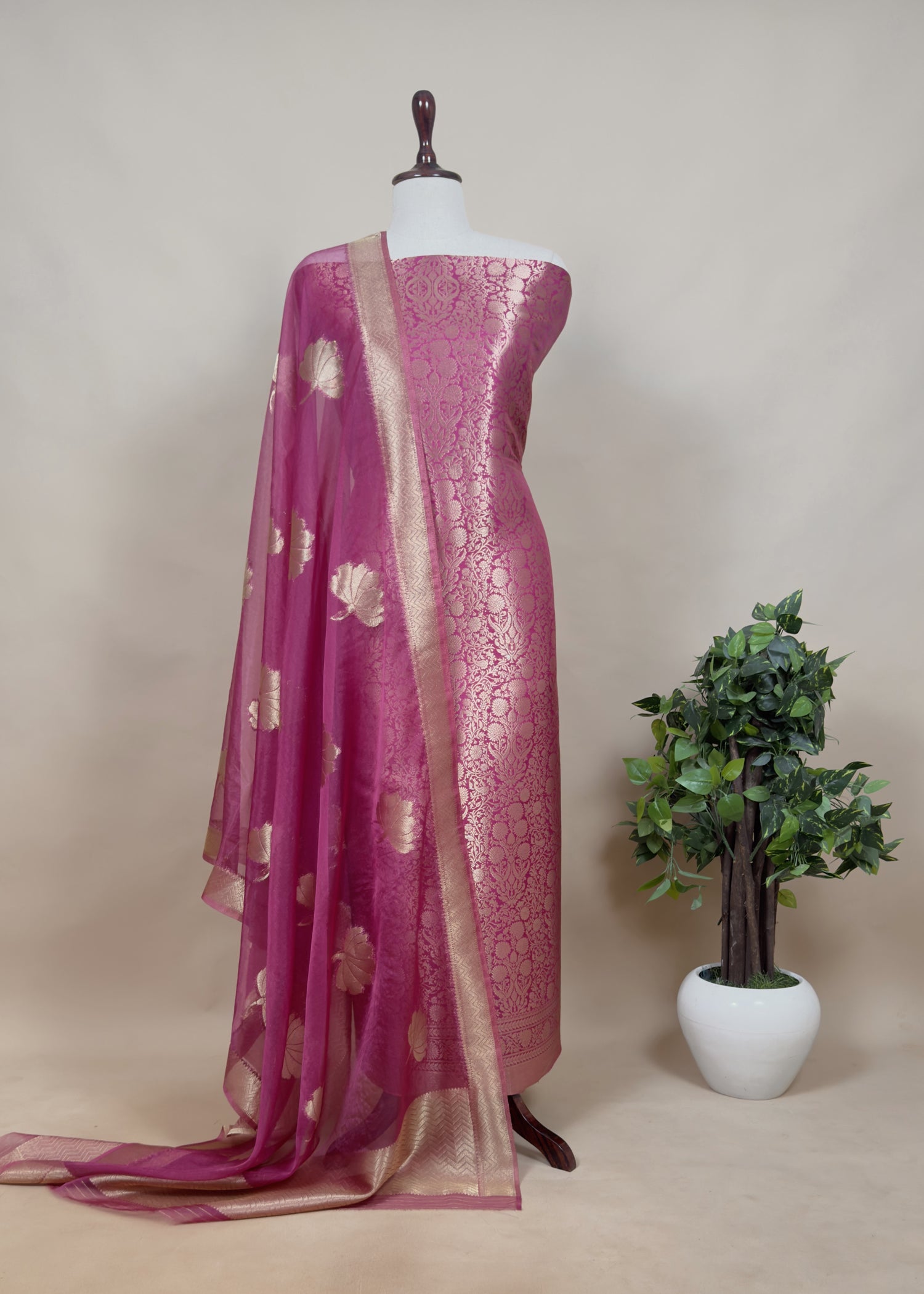 Yellow Banarasi Silk Brocade Suit With Organza Dupatta