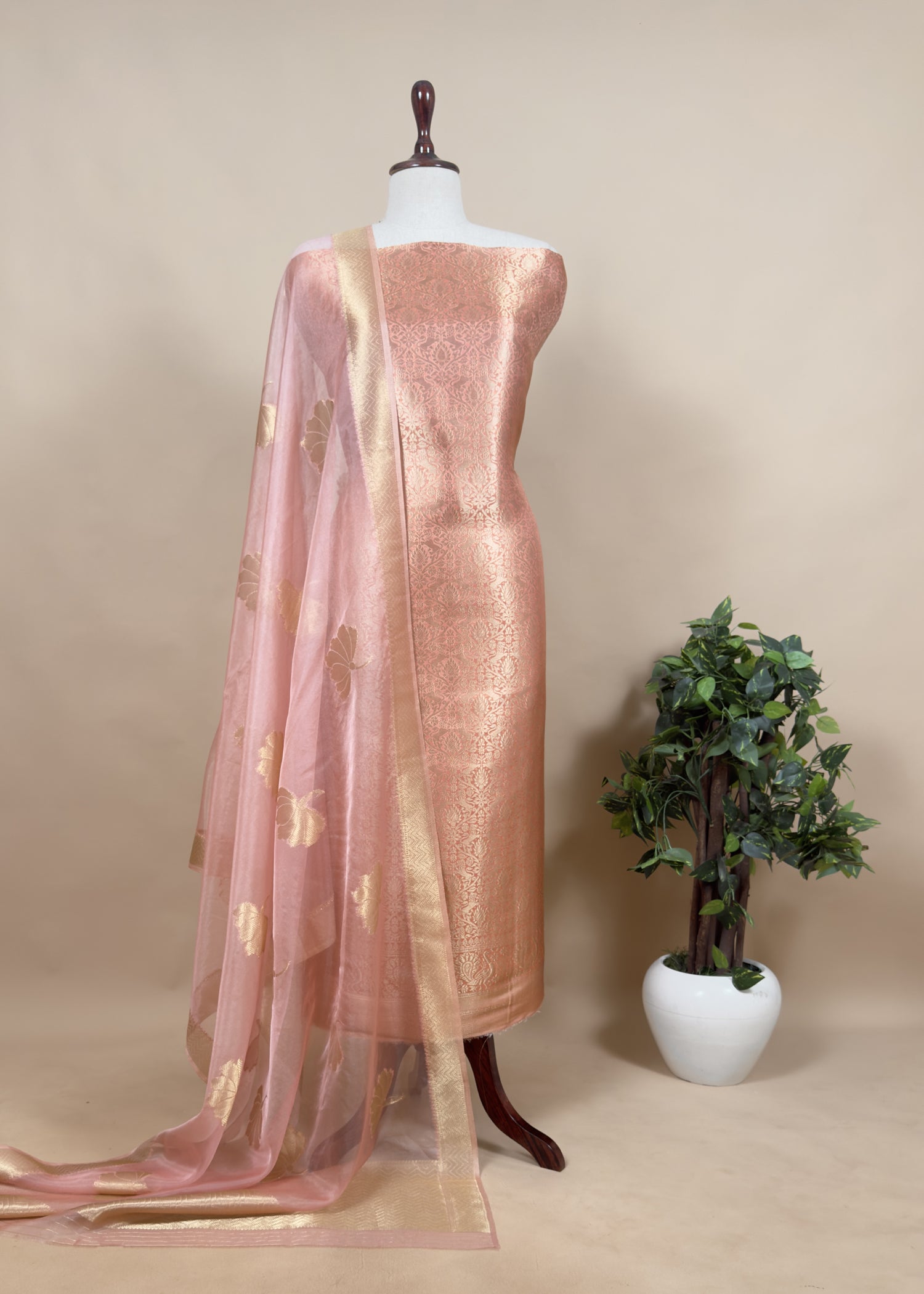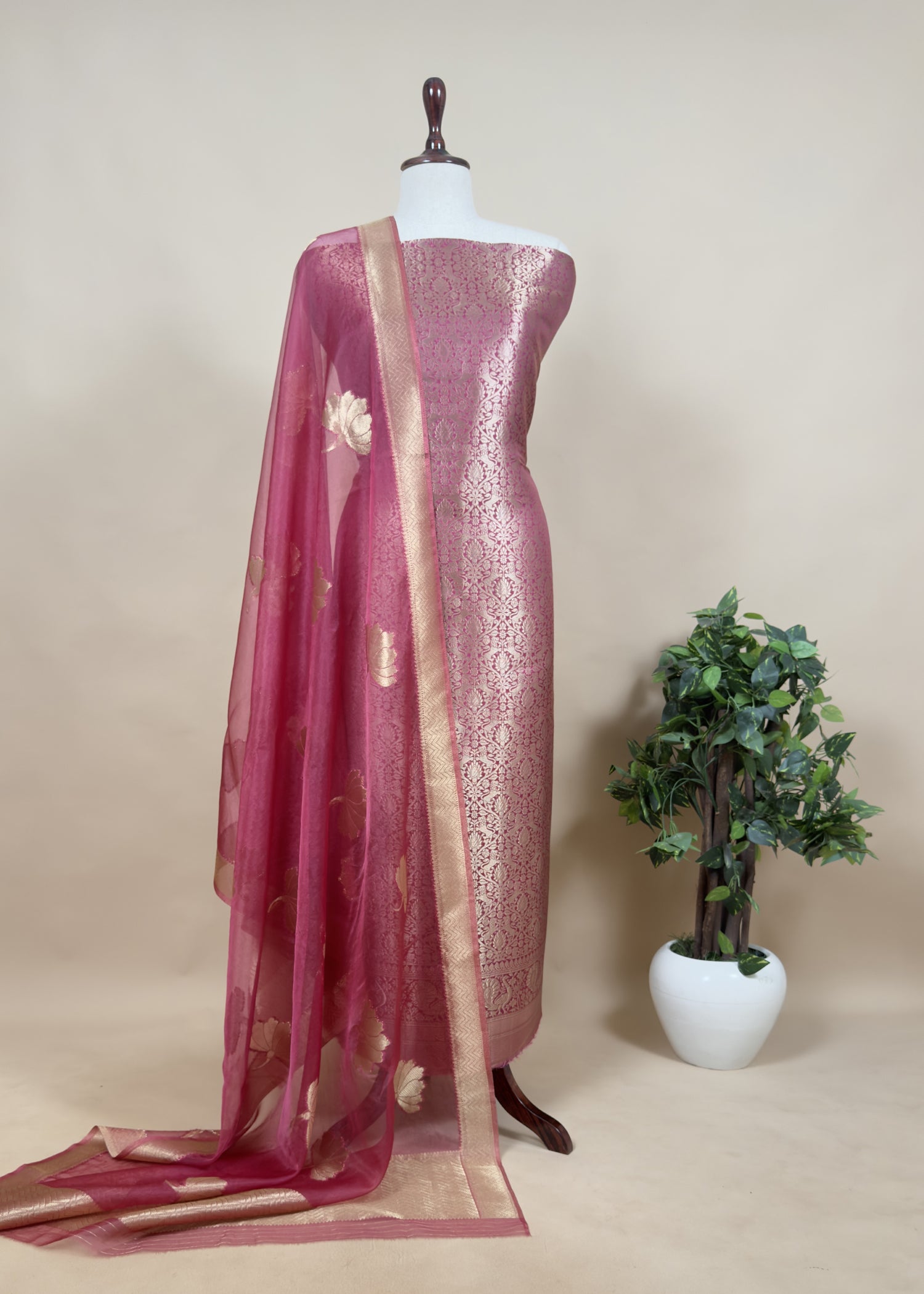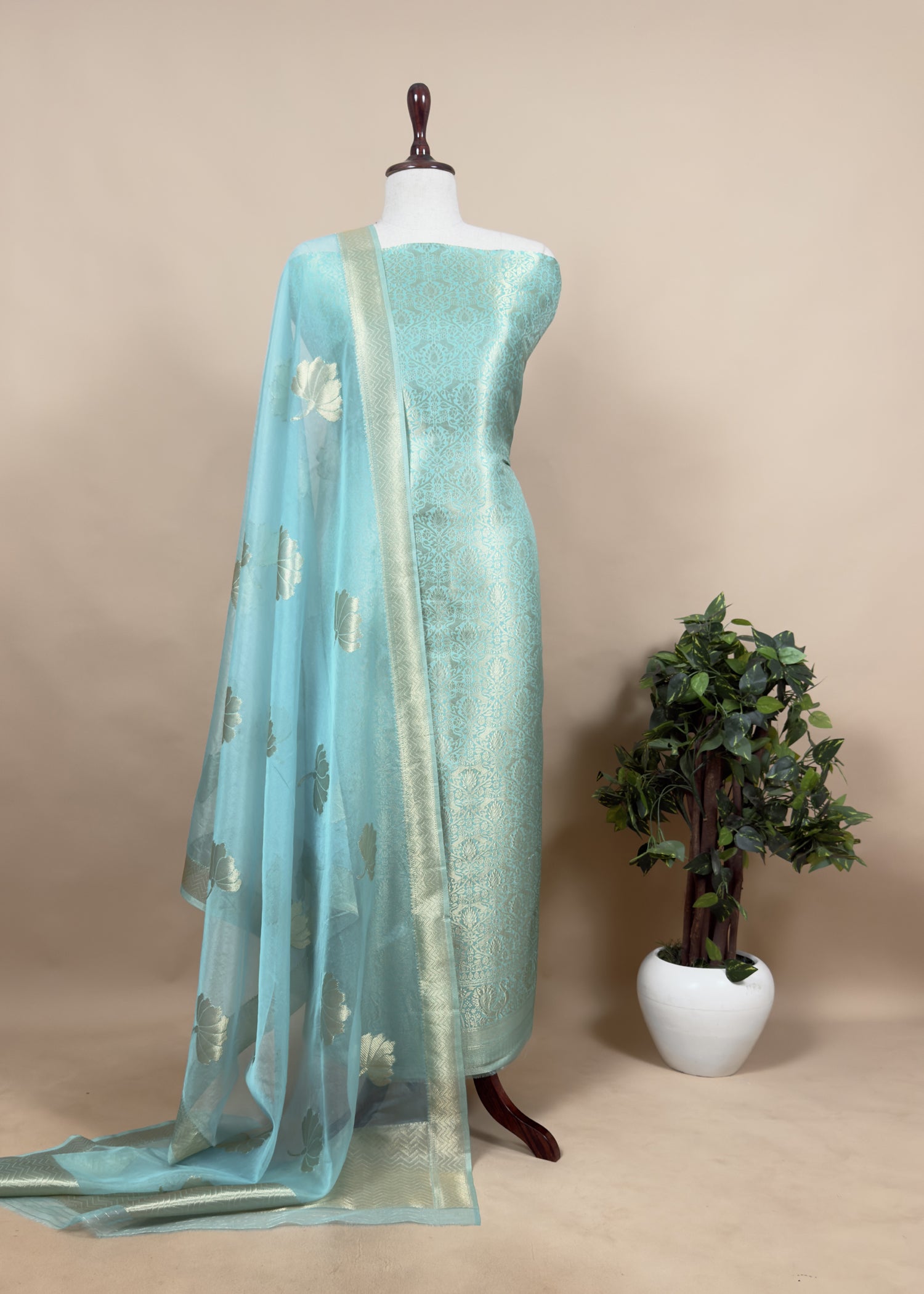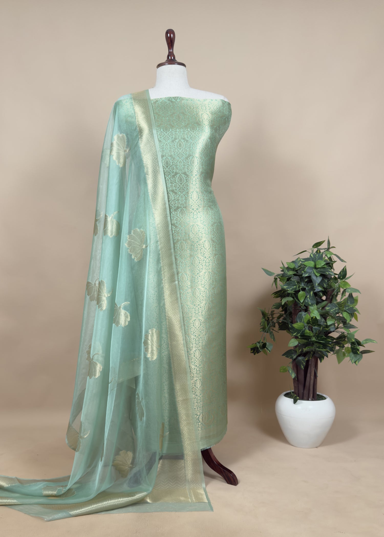 Yellow Banarasi Silk Brocade Suit With Organza Dupatta