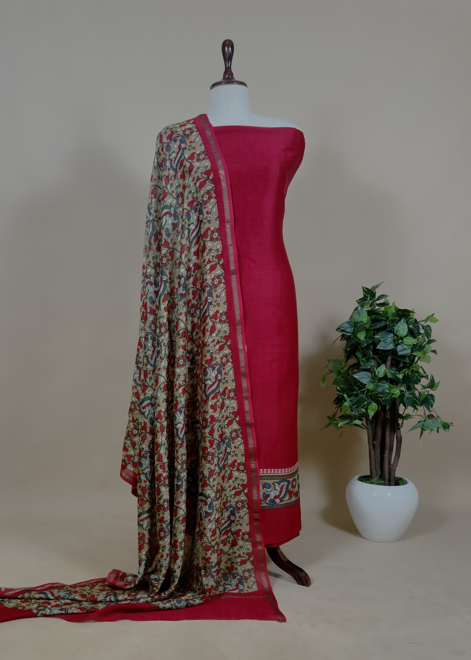 Yellow Handloom Maheshwari Silk Unstitched Suit with Kalamkari Dupatta
