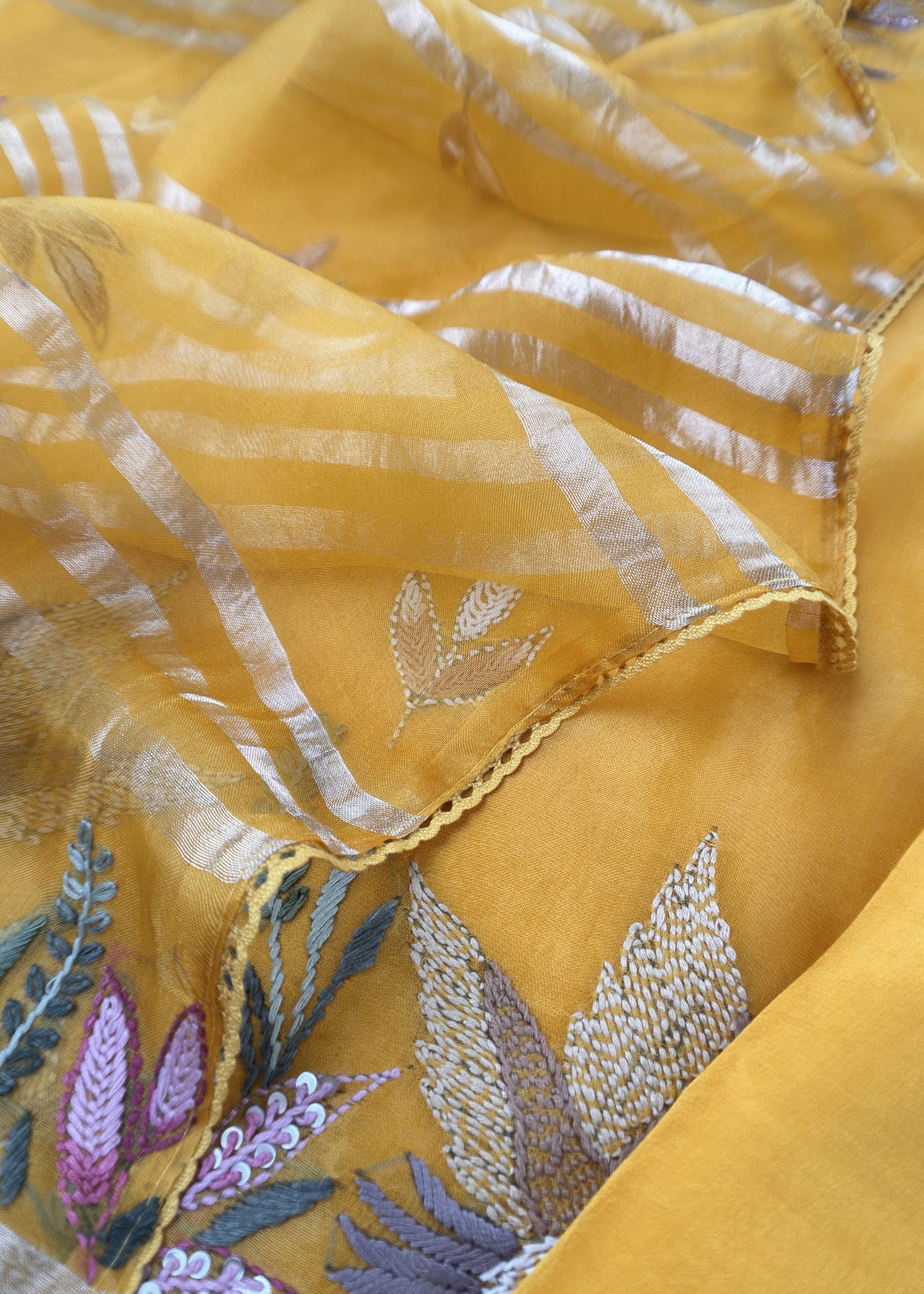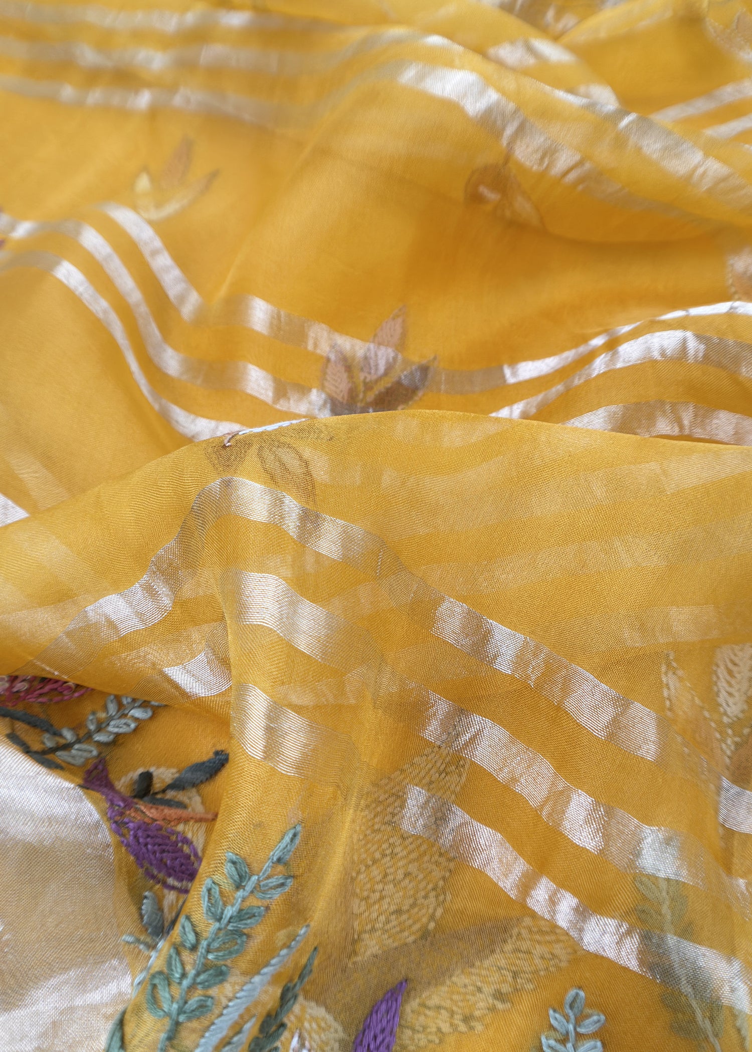 Yellow Handloom Organza Silk Suit Fabric With Flamingos Kantha Handwork