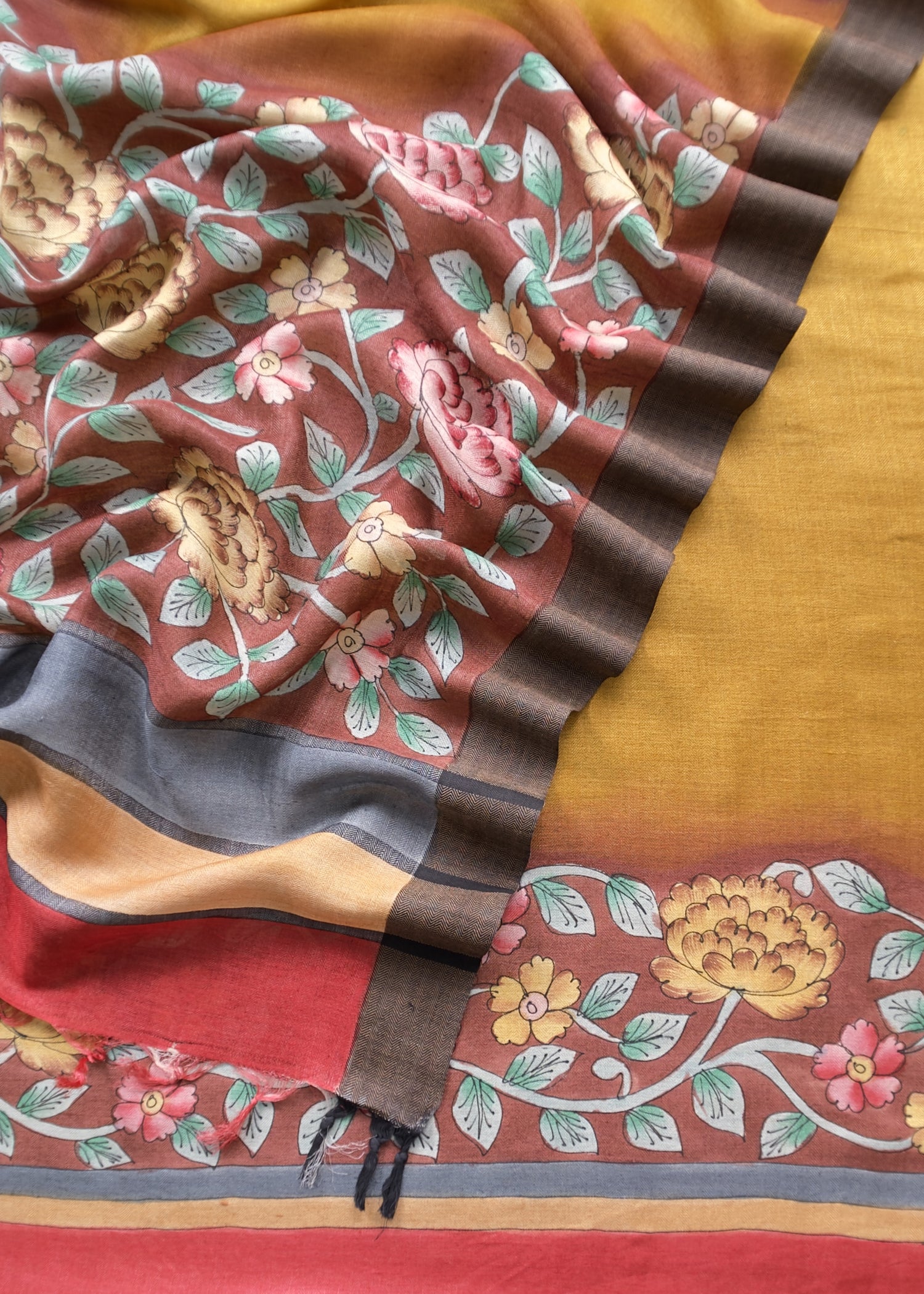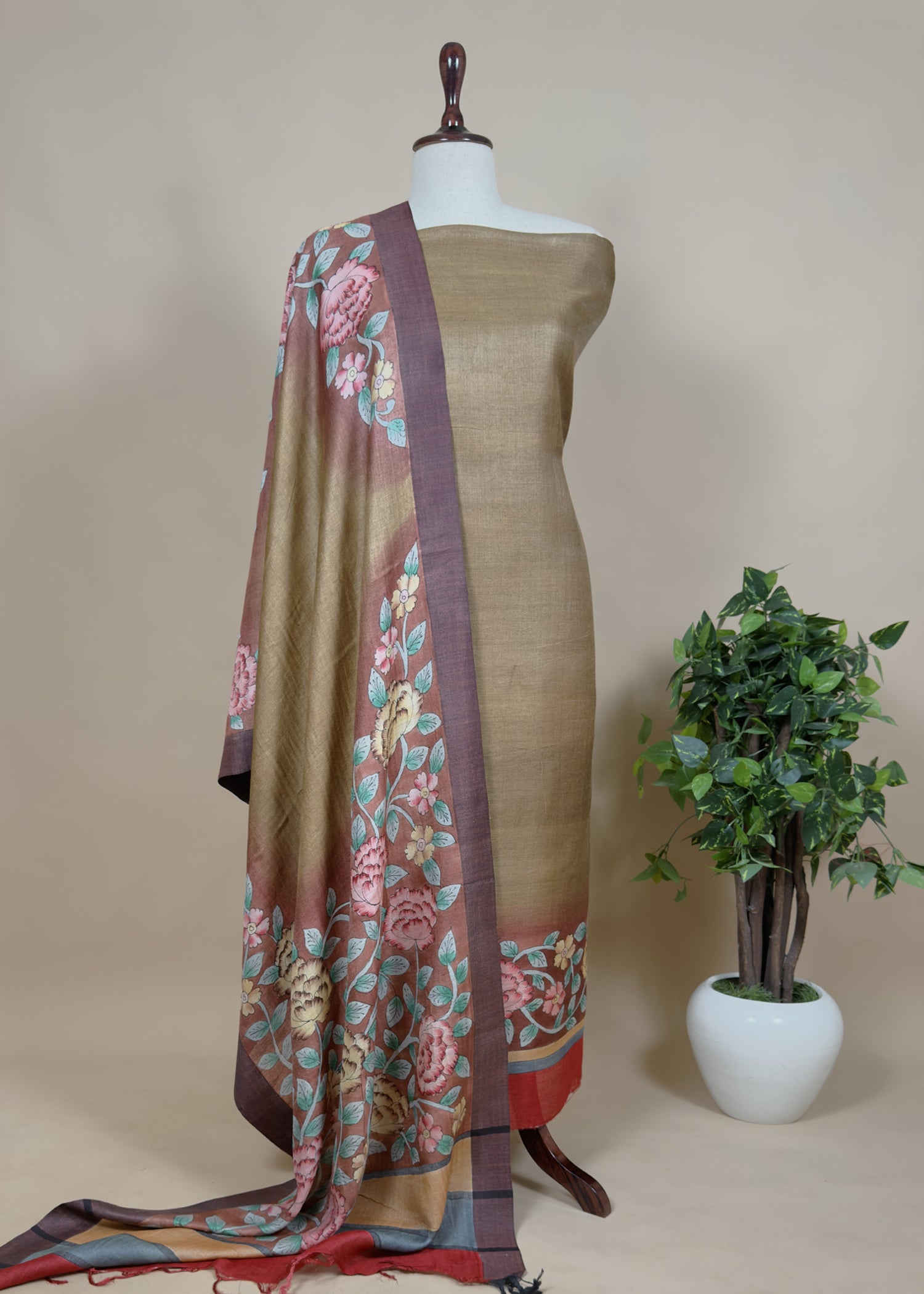 Yellow Handloom Pashmina Suit With Hand Painted Kalamakari
