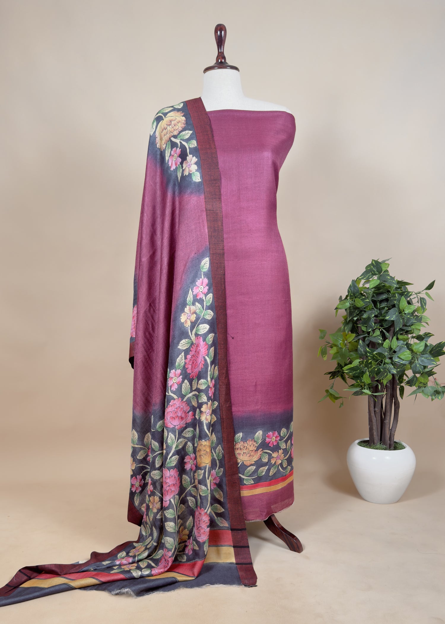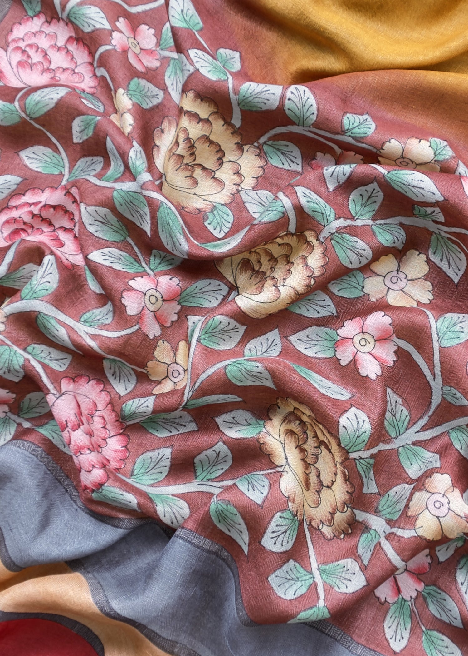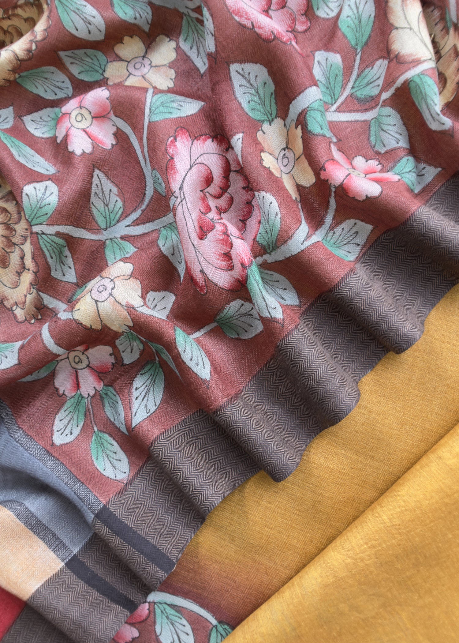 Presenting you our hand-painted Kalamkari collection from Kalasheel winter edit featuring pashmina kurta with hand-painted Kalamkari phool ghera paired with all over double shade pashmina dupatta with hand-painted Kalamkari phool brush print all over it. The suit comes with fine-quality matching lowers.
