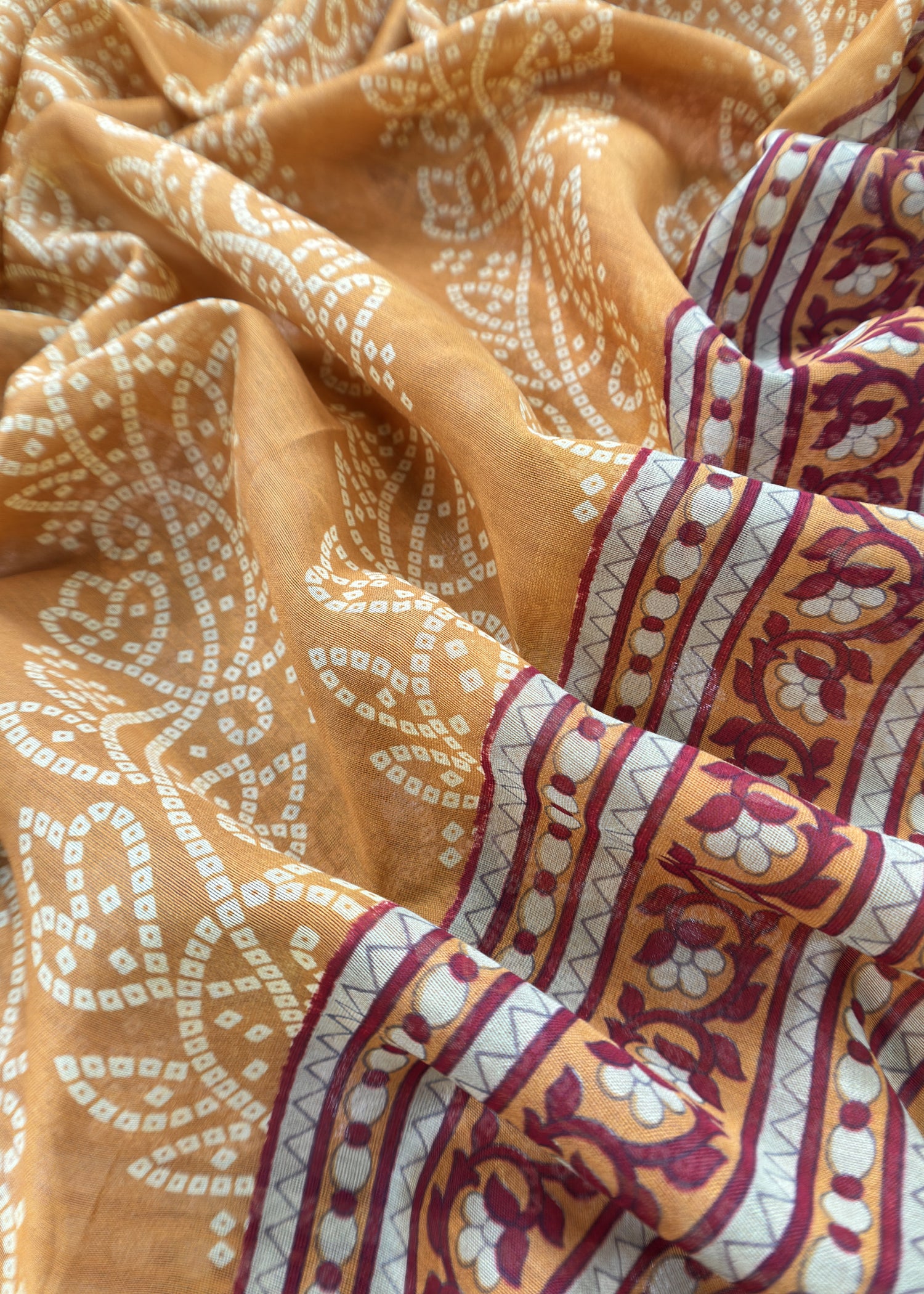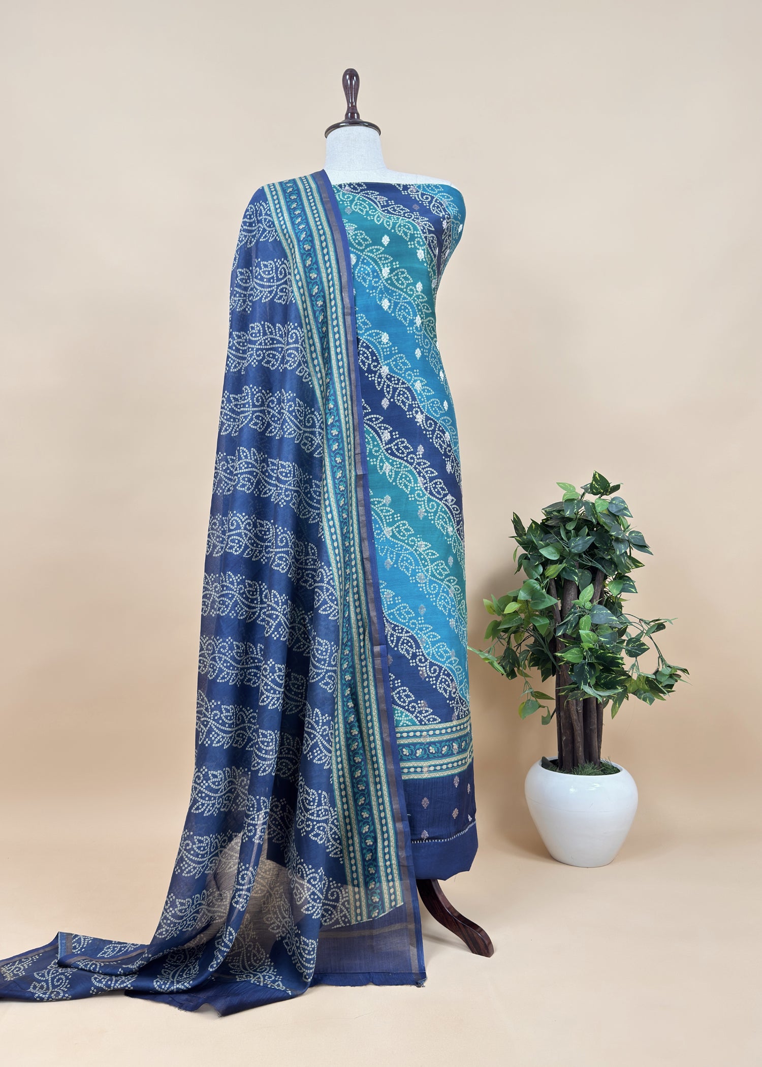 Presenting our bestselling unstitched three-piece suit set, crafted from pure Maheshwari silk. The Maheshwari silk kurta and dupatta feature a colorful Bandhani print. This suit set is completed with a pure satin cotton bottom.