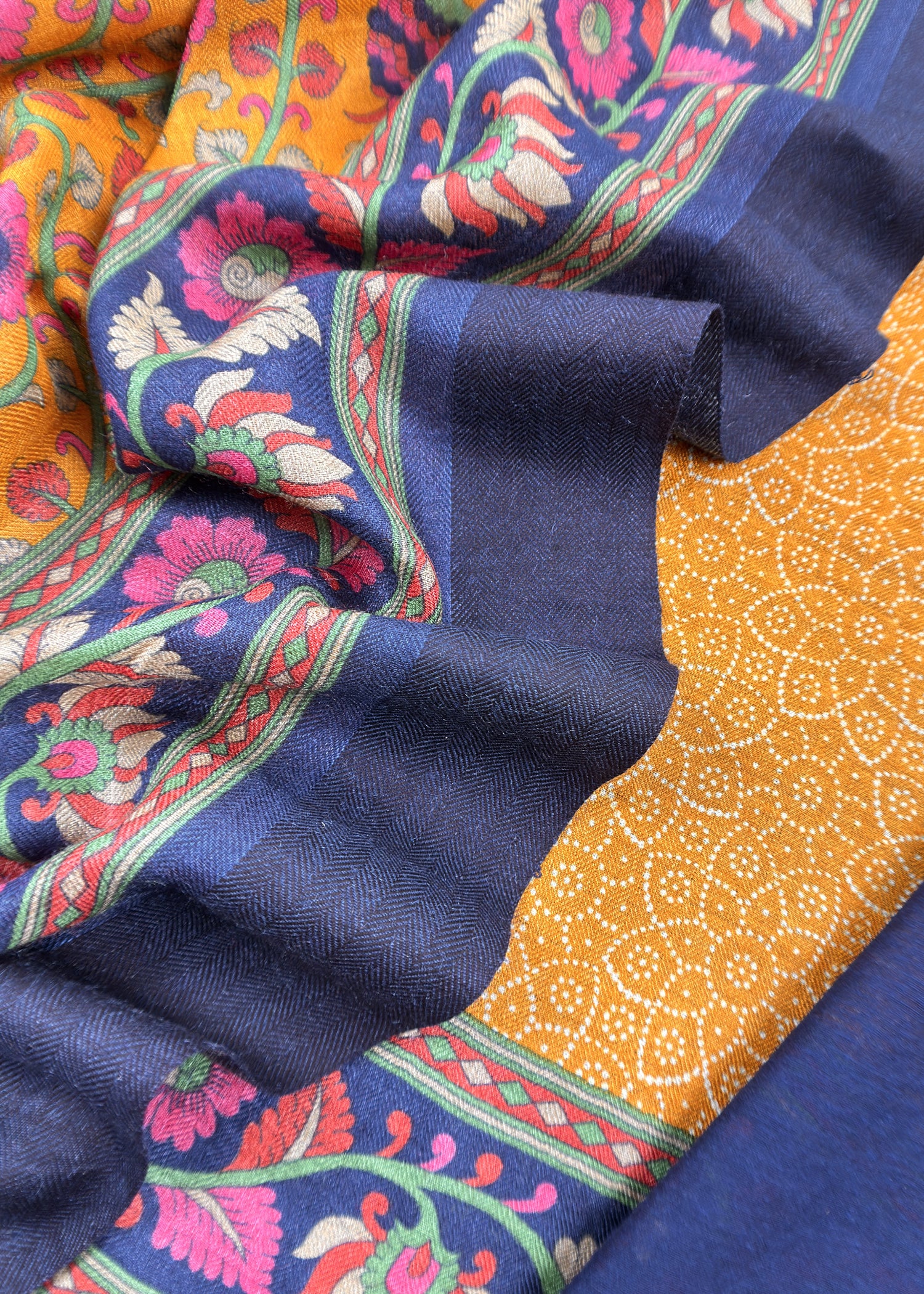 Pure pashmina vibrant plain kurta with pure pashmina kalamkari print dupatta and pashmina bottom.
