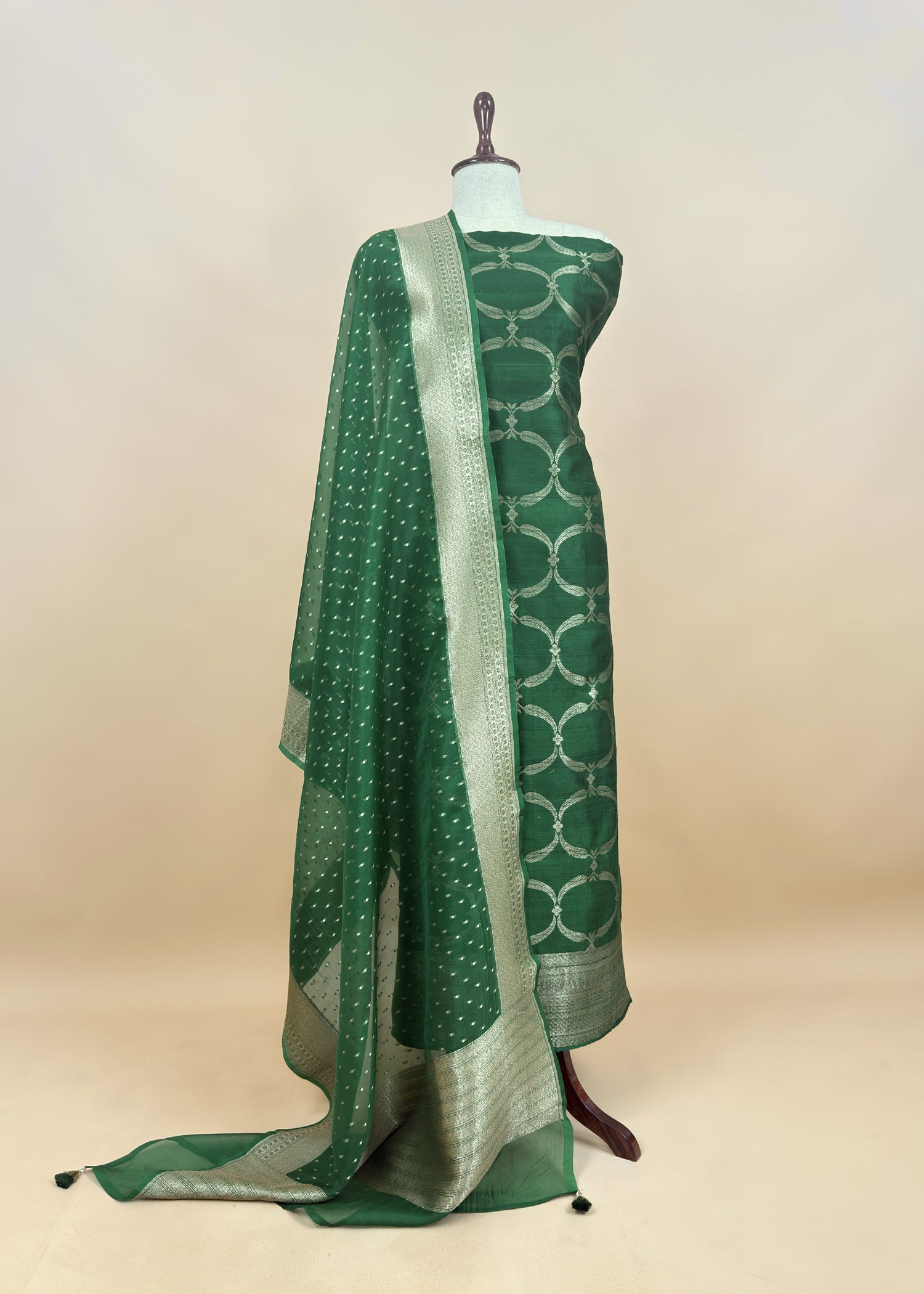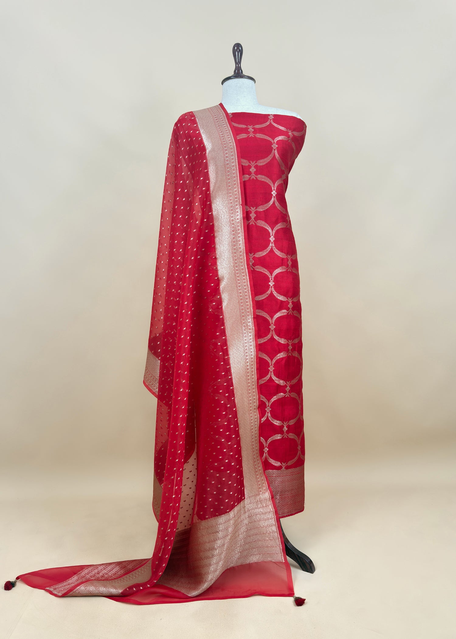 Stunning pure Banarasi silk kurta and pure kora silk dupatta with daba hua all over cutwork zari weaving paired with matching silk lowers.