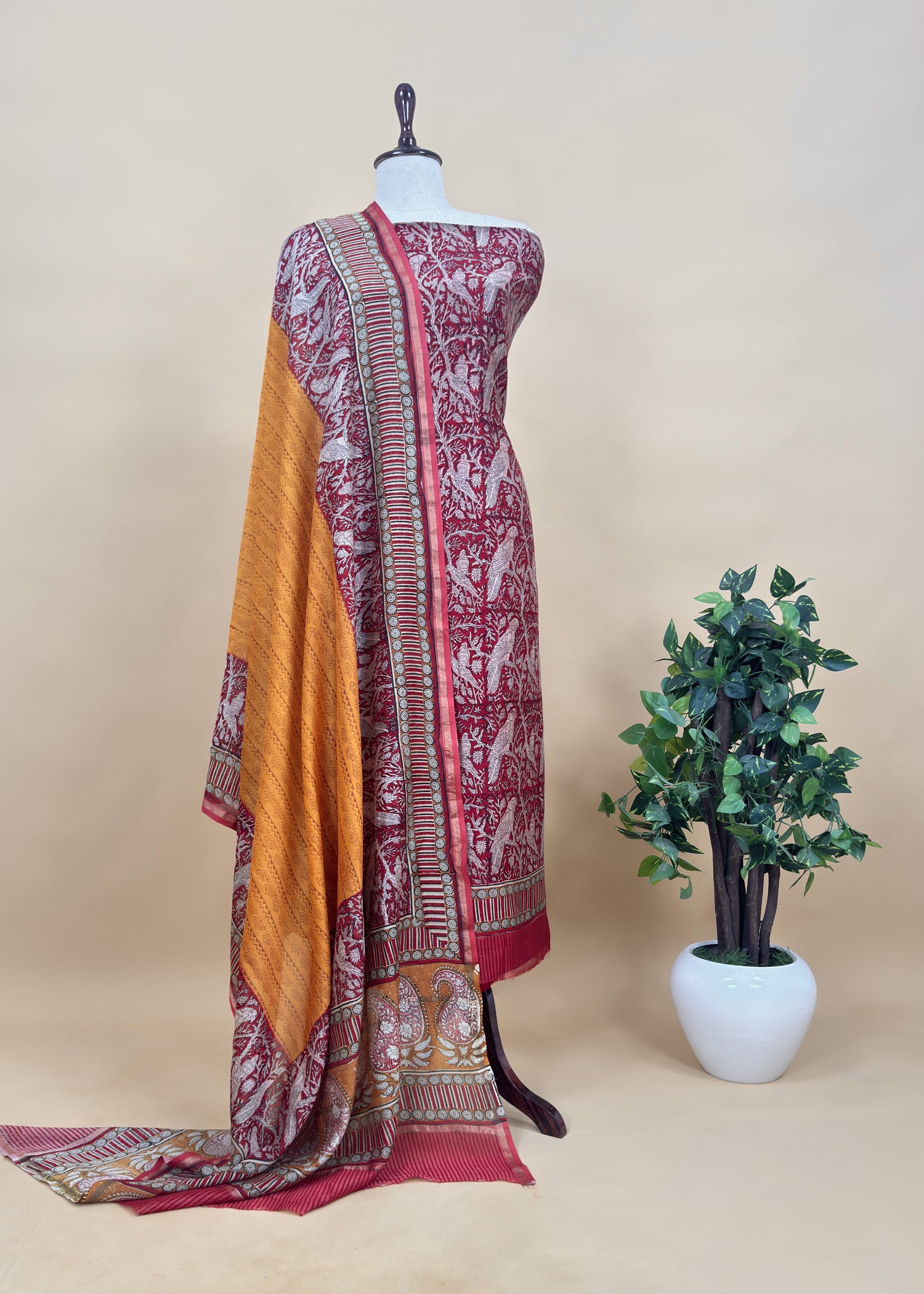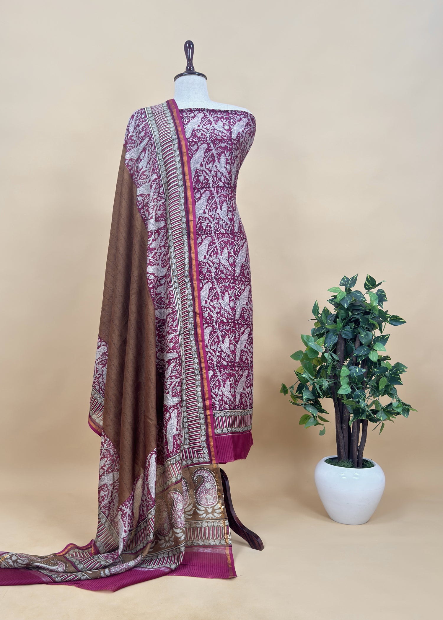Step into comfort with this maheshwari silk suit embellished with Parrot Print kurta and dupatta having parrot and paisley border on the ghera of kurta and plain chanderi cotton bottom.