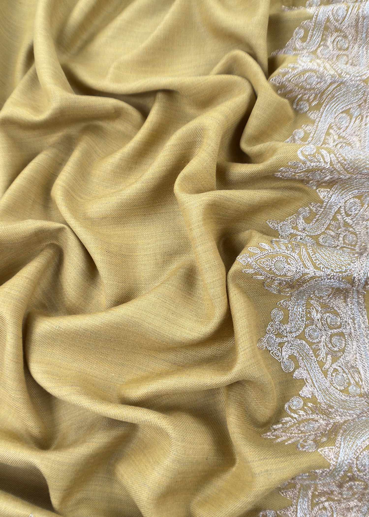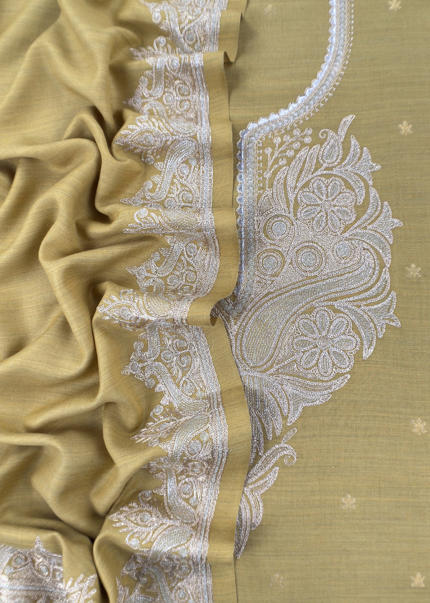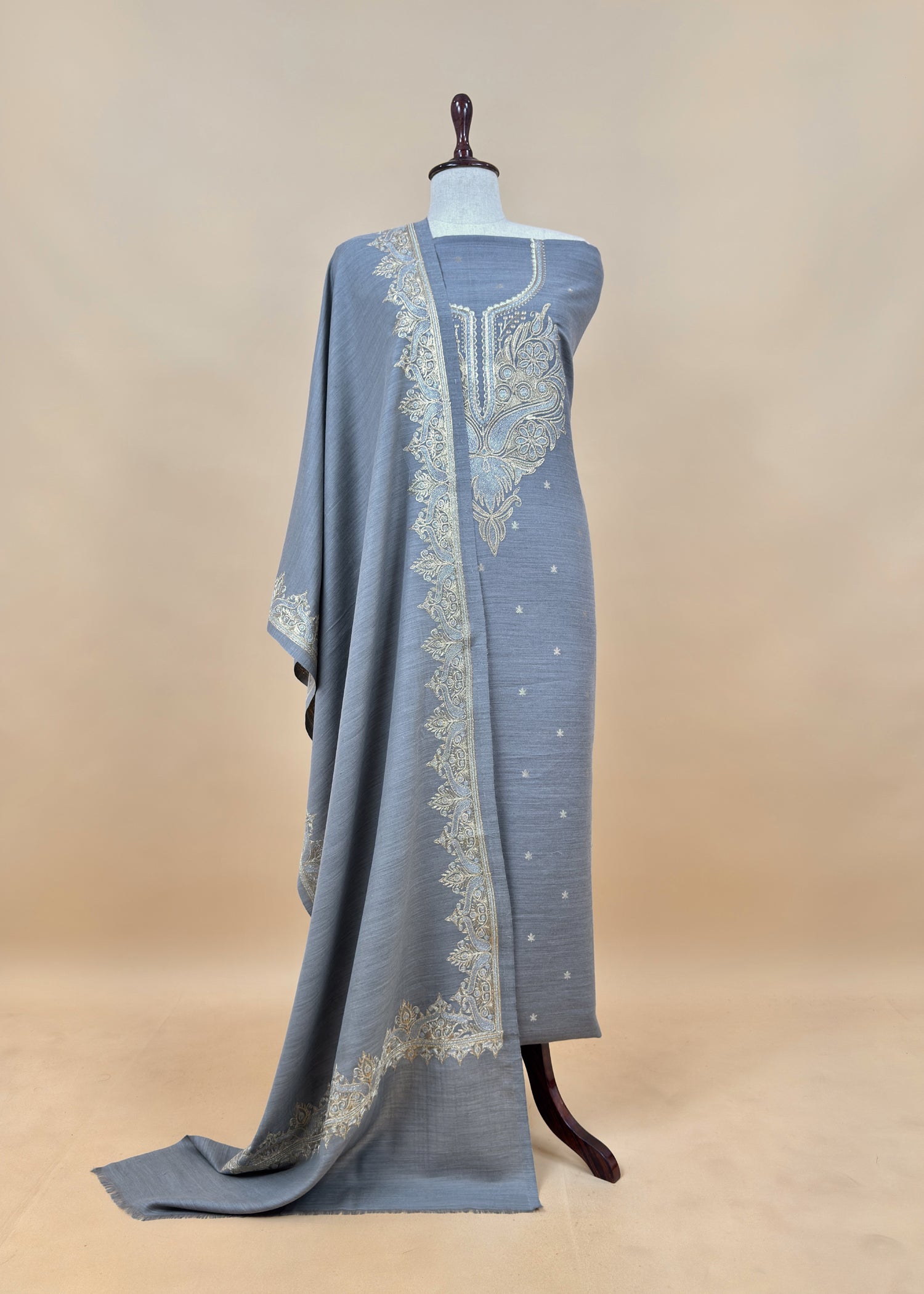 Unstitched three piece woolen suit embraced with beautiful Aari Zari embroidery is complimented with pure wool bottom.